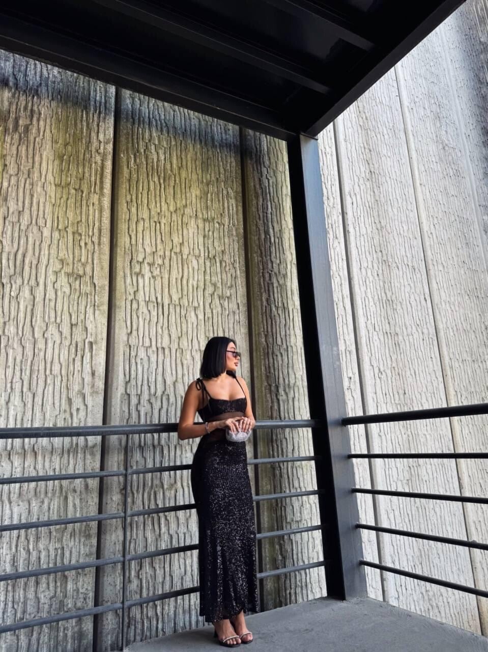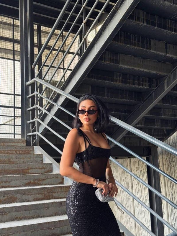 Bëhu qendra e vëmendjes me këtë fustan të zi modern, i zbukuruar me temina shkëlqyese dhe detaje prej rrjete elegante. Dizajni me rripa i jep një pamje femërore dhe tërheqëse, ndërsa kombinimi i materialeve garanton rehati dhe fleksibilitet. I punuar nga 95% poliester dhe 5% elastan, ky fustan është ideal për mbrëmje, festa apo evente speciale.