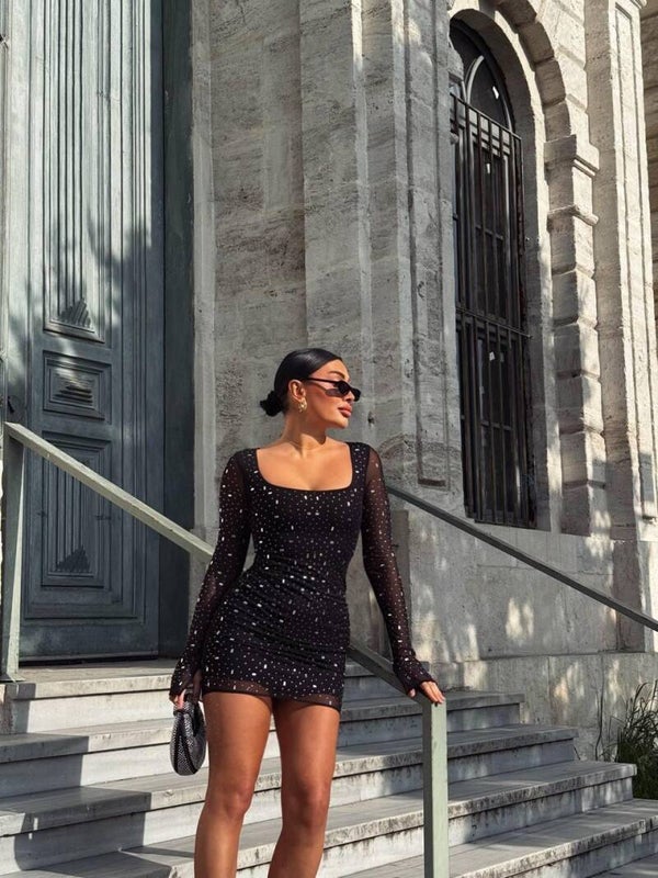 Ky fustan i zi i shkurtër është zgjedhja perfekte për të gjitha gratë që duan të kombinojnë elegancën me stilin modern. Detajet me gurë të vendosura me kujdes i japin një shkëlqim të veçantë dhe e kthejnë fustanin në një veshje që bie në sy në çdo rast.