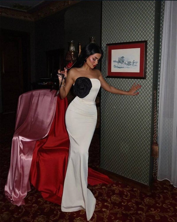 Ky fustan i gjatë elegant vjen në një nuancë të bardhë krem dhe dizajn pa rripa (strapless), duke nxjerrë në pah shpatullat me finesë. Prerja e ngushtë ndjek linjat e trupit dhe hapet butësisht në fund në stil sirene, duke krijuar një siluetë mahnitëse. Detaji i trëndafilit të zi në pjesën e gjoksit sjell kontrast luksoz dhe e bën këtë fustan një zgjedhje perfekte për mbrëmje speciale, dasma apo evente ku eleganca është thelbi