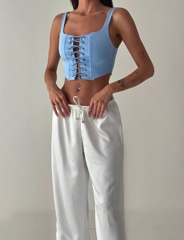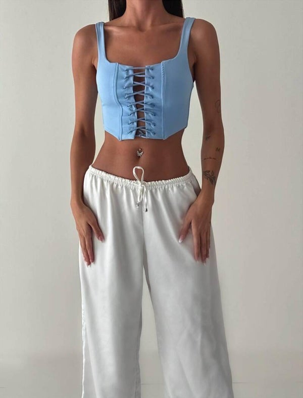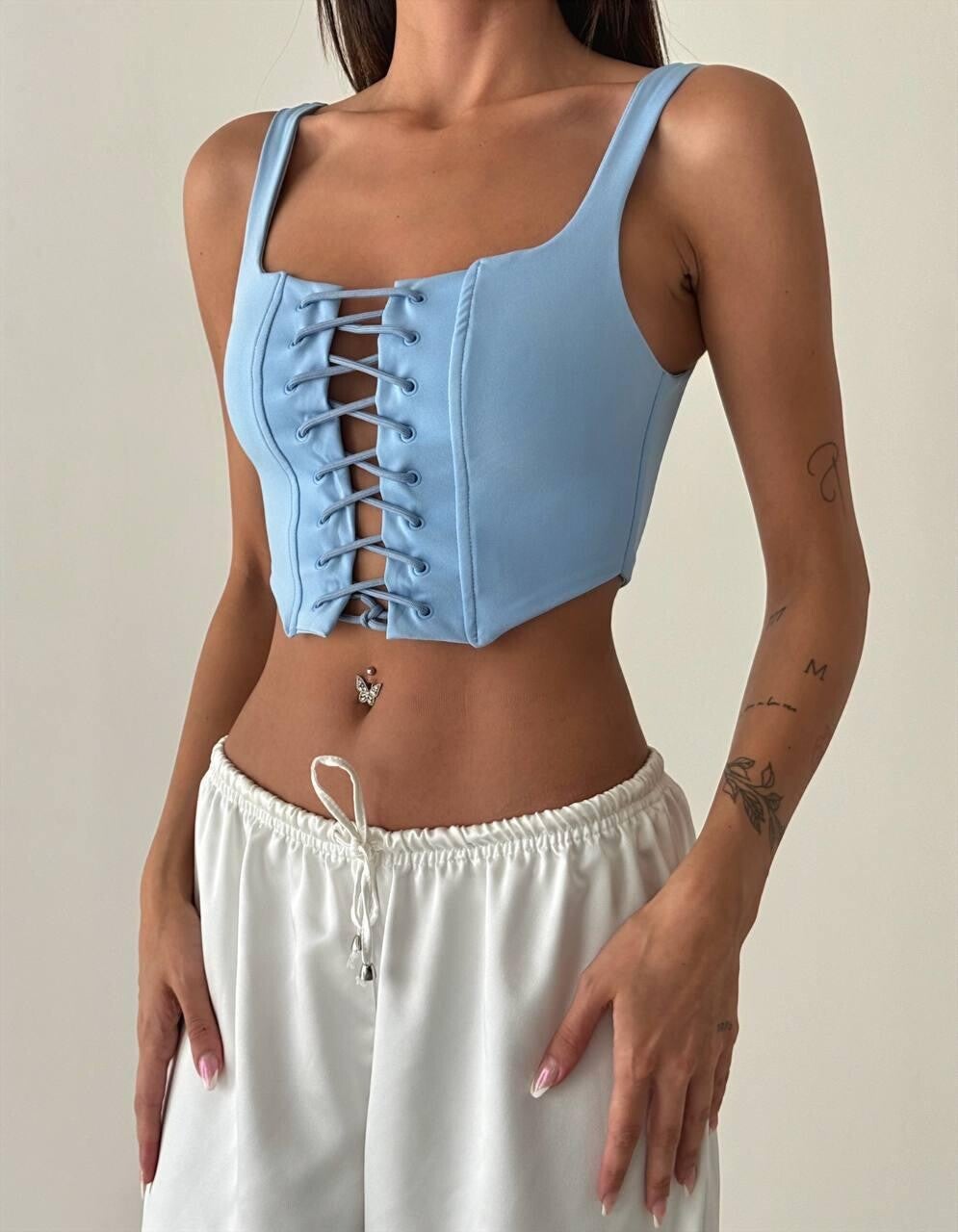 Ky crop top në ngjyrë blu qielli sjell një stil modern dhe femëror. Modeli bustier me shpatulla të gjera ka lidhëse dekorative në pjesën e përparme që lejojnë rregullim dhe krijojnë një pamje unike. Pëlhura elastike dhe e butë e bën të rehatshëm dhe perfekt për t’u kombinuar me xhinse, pantallona apo funde për një look casual-chic