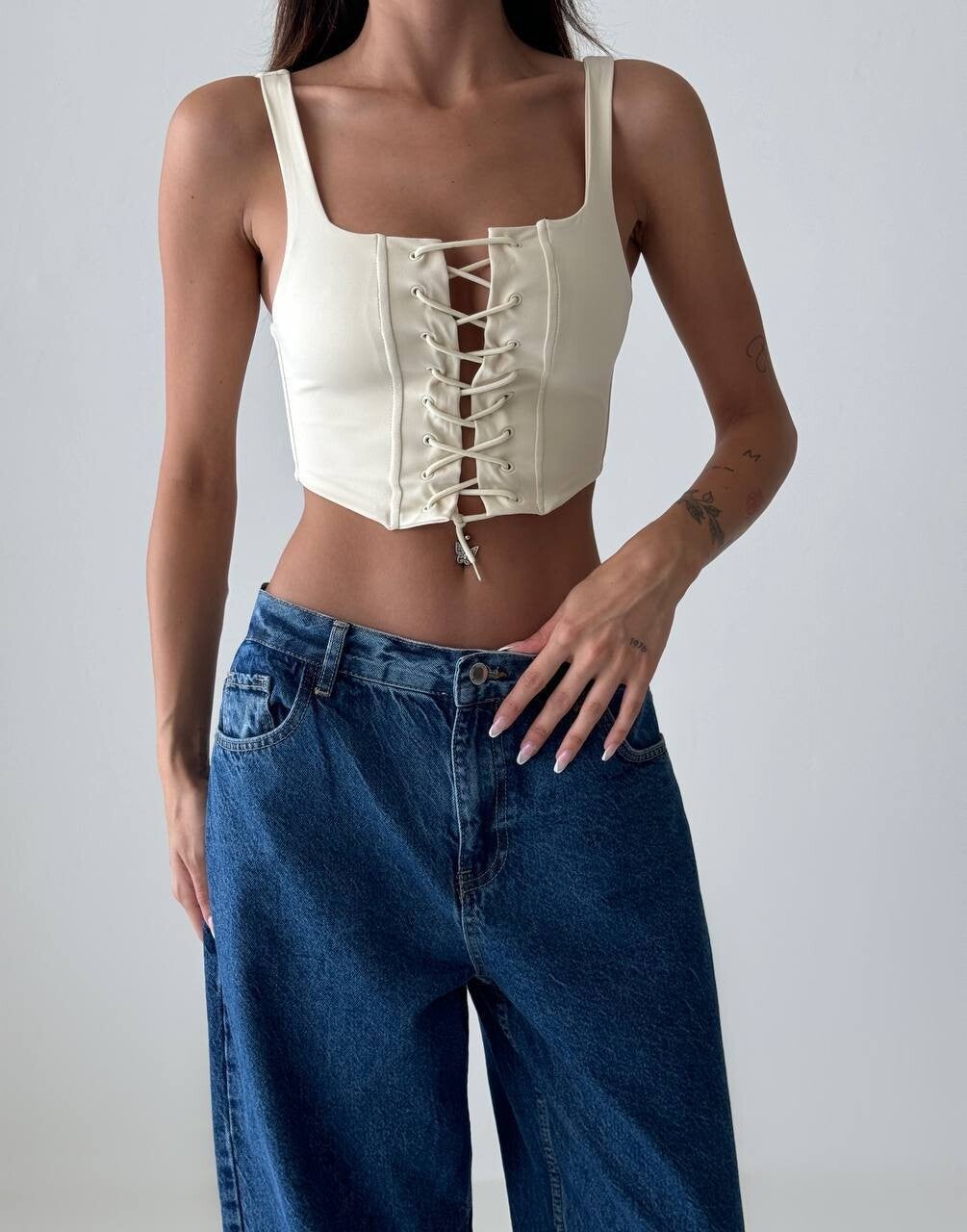 Ky crop top në ngjyrë bezhë sjell një pamje moderne dhe shumë femërore. Modeli bustier me shpatulla të gjera ka lidhëse dekorative në pjesën e përparme që mundësojnë rregullim sipas dëshirës, duke i dhënë një efekt unik dhe trendy. Pëlhura elastike dhe e butë ofron rehati, ndërsa prerja e shkurtër është perfekte për t’u kombinuar me xhinse, pantallona apo funde për një look casual-chic ose mbrëmje verore