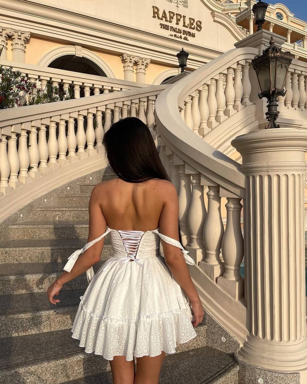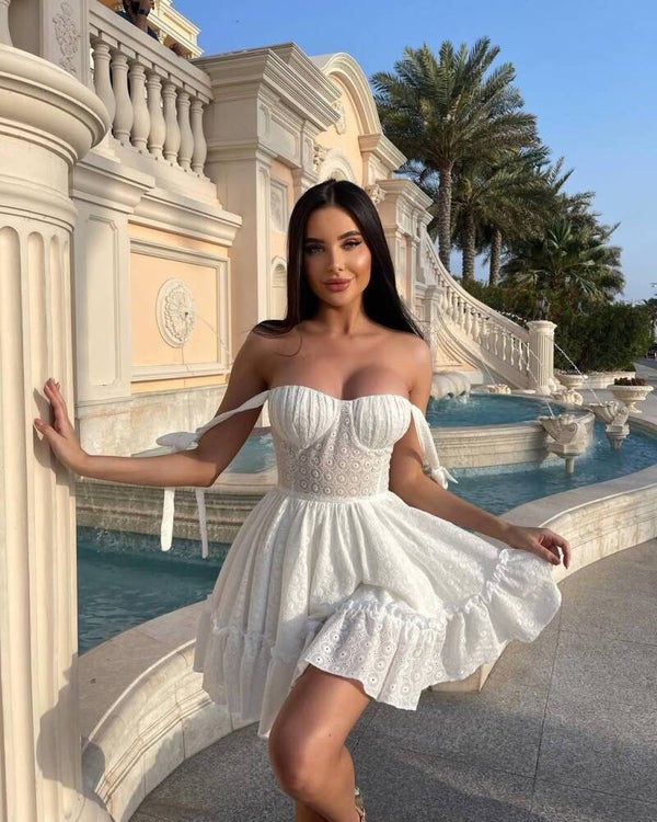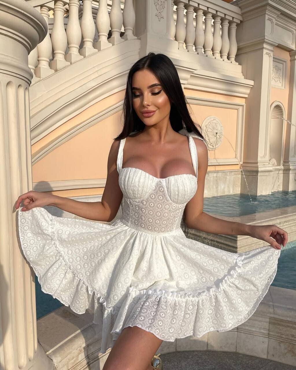Ky fustan i bardhë romantik sjell një kombinim të përsosur mes finesës dhe freskisë verore. Me detaje dantelle me vrima (broderie anglaise), ai ka një strukturë bustiere që formëson bukur pjesën e sipërme dhe jep mbështetje perfekte. Pjesa e poshtme me pala të lehta krijon volum delikat dhe lëvizje elegante, ndërsa rripat e gjerë ofrojnë rehati dhe qëndrueshmëri. Materiali i butë dhe frymëmarrës e bën ideal për ditët me diell, shëtitje buzëdeti, evente në kopsht apo festa ditore, duke dhuruar një pamje femërore dhe plot shkëlqim natyral