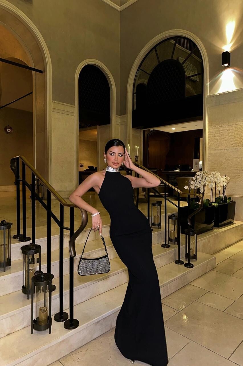 Ky fustan i gjatë në ngjyrë të zezë përfaqëson elegancën klasike me një prekje moderne. Dizajni me qafë halter thekson linjat e shpatullave dhe qafës, ndërsa përshtatja e ngushtë pas trupit krijon një siluetë të rafinuar e femërore. Detaji me jakë të zbukuruar me gurë shkëlqyes rrit shkëlqimin dhe i jep një nuancë luksoze pamjes. Pëlhura e butë dhe e lehtë ofron rehati dhe lëvizje elegante, duke e bërë perfekt për evente gala, darka formale apo festa ekskluzive ku kërkohet një look i paharrueshëm
