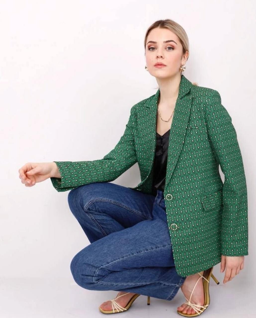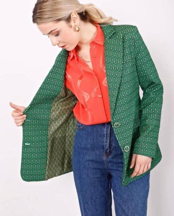 Xhaketë në ngjyrë jeshile me print gjeometrik që bie në sy, kombinon stilin klasik me një energji moderne. Ka një model me motive diamanti në të zezë dhe të bardhë, si në pjesën e jashtme ashtu edhe në astarin e brendshëm, duke krijuar një efekt unik vizual. Poshtë saj, këmisha në ngjyrë portokalli me shkëlqim të lehtë sjell kontrast të gjallë dhe plot jetë. Kombinimi me xhinse të drejta blu i jep veshjes një pamje casual-chic, perfekte për një paraqitje të freskët në zyrë apo për dalje urbane me stil