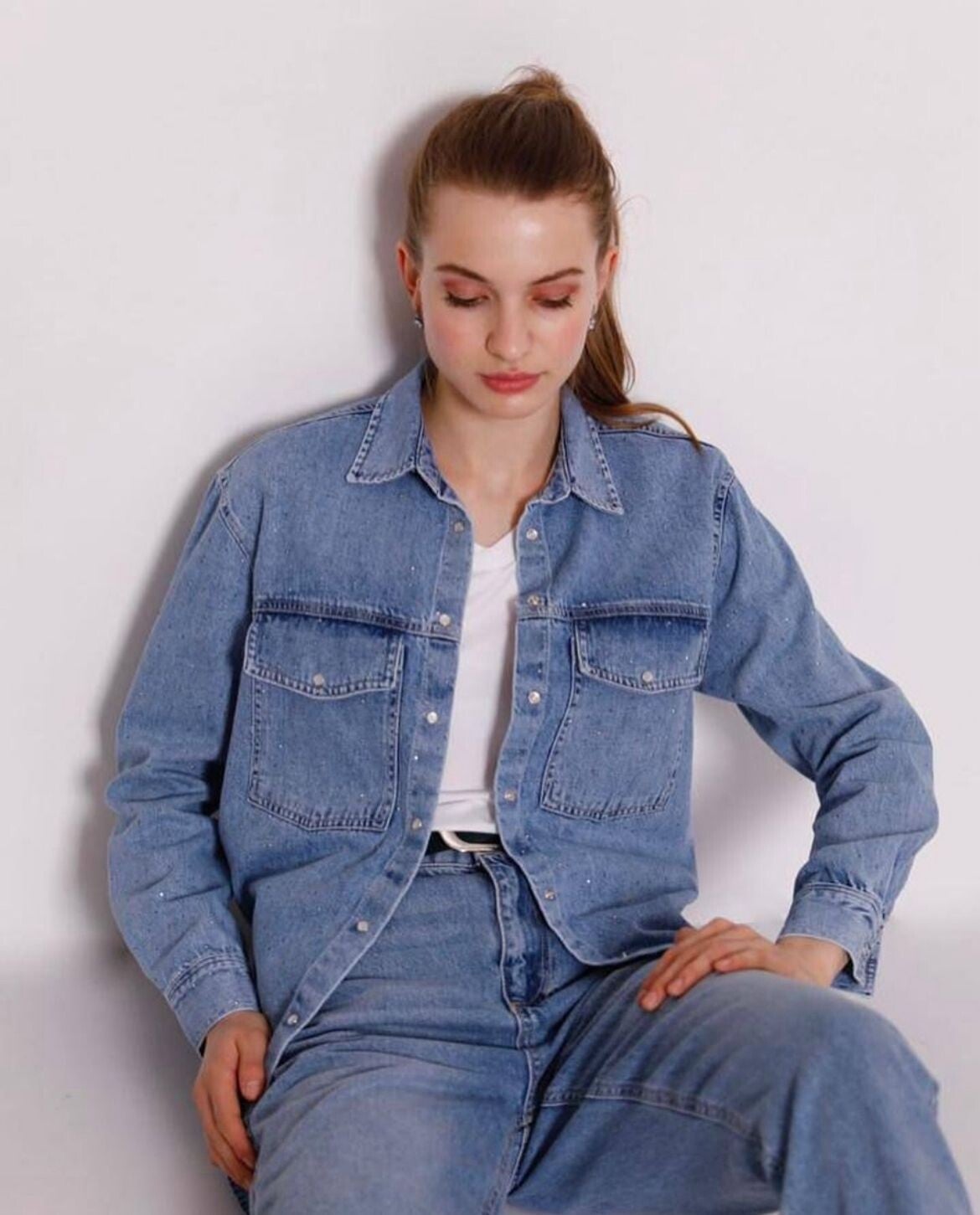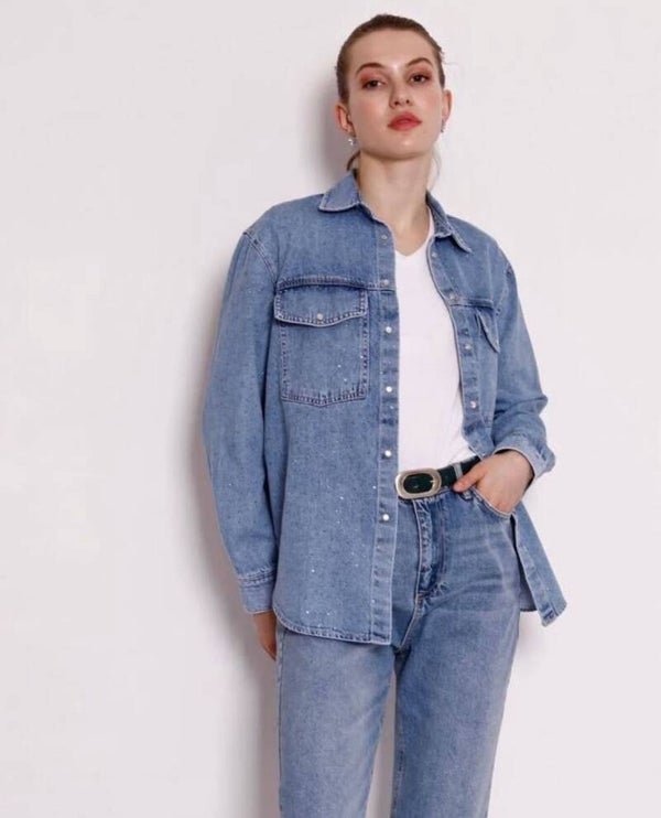 Këmishë xhins femrash me stil casual dhe modern, ideale për kombinime të përditshme. E realizuar nga material denim cilësor, kjo këmishë ofron rehati dhe qëndrueshmëri. Ka prerje të lirshme, xhepa funksionalë në pjesën e përparme dhe mbyllje me kopsa metalike për një pamje praktike dhe trendi. Mund të vishet si këmishë apo si xhaketë e lehtë, duke e bërë një pjesë shumëpërdoruese në garderobë.