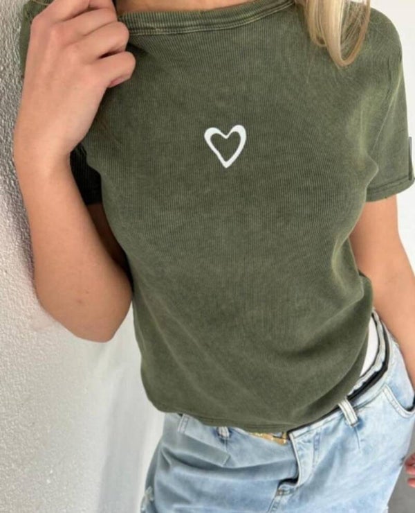 Bluzë T-shirt në ngjyrë jeshile ushtarake me detaj zemre – një veshje që ndërthur stilin e përditshëm me një mesazh delikatesh dhe thjeshtësie. Ky T-shirt është zgjedhja ideale për ato ditë kur dëshironi të ndiheni rehat, por pa sakrifikuar stilin. Dizajni minimalist me një zemër të vogël të bardhë të vendosur në qendër i jep bluzës një pamje të ëmbël dhe plot personalitet, duke e bërë të përshtatshme për çdo moshë dhe për çdo moment të ditës.Materiali është i butë dhe i rehatshëm, duke ofruar ndjesinë e këndshme të pambukut të cilësisë së lartë, Struktura e lehtë e pëlhurës bën që bluza të përshtatet në mënyrë natyrale me trupin, pa u ndjerë e rëndë apo e ngushtë.. Mund ta vishni e vetme për një pamje të thjeshtë, ose ta shtresoni me një xhaketë xhins apo një kardigan të ngrohtë në ditët më të freskëta.