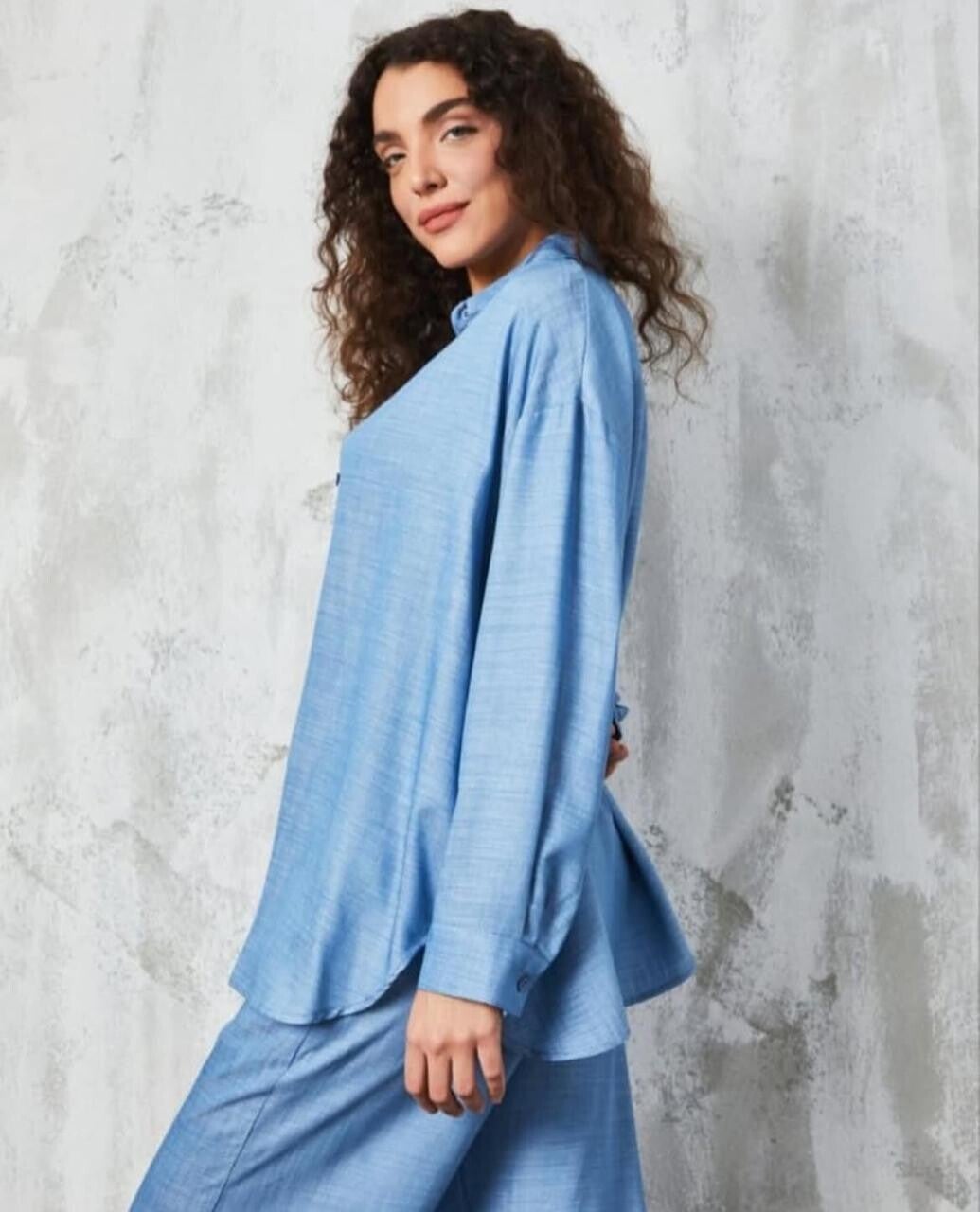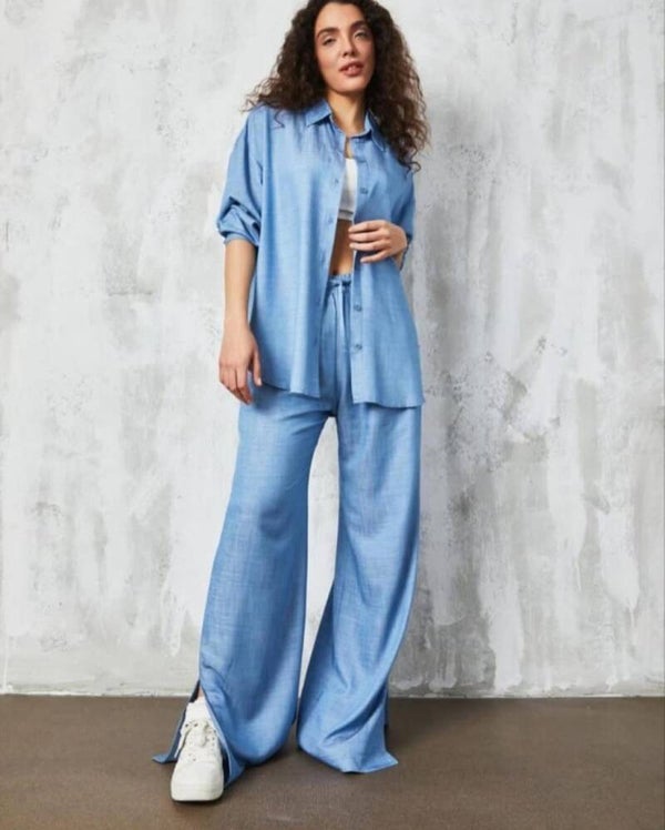 Set dy pjesësh në ngjyrë blu qielli – elegancë, rehati dhe stil urban në një kombinim perfekt. Ky set është një zgjedhje ideale për ditët kur kërkoni një pamje të kuruar, por pa sakrifikuar komoditetin. Me një prerje të lirshme dhe një ngjyrë të freskët, ky komplet sjell një ndjenjë sofistikimi dhe thjeshtësie moderne, duke e bërë atë të përshtatshëm për çdo rast – nga dita në zyrë, tek shëtitjet në qytet apo edhe eventet casual.Përbëhet nga këmisha e gjatë dhe pantallonat me bel elastik, të cilat kombinohen në mënyrë perfekte për një pamje harmonike dhe të balancuar. Këmisha ka një dizajn klasik me jakë dhe mbyllje me kopsa, por me një prerje të lirshme që lejon lëvizje të lirë dhe krijon një pamje “oversized” shumë në trend. Mund të vishet e hapur mbi një top të shkurtër për një stil sportiv, ose e mbyllur për një pamje më elegante. Pjesa e poshtme, pantallonat me bel të lartë dhe elastik, janë të dizajnuara për të ofruar rehati maksimale dhe përshtaten lehtësisht me çdo lloj trupi, ndërkohë që gjatësia e gjatë dhe prerja e gjerë krijojnë një efekt vizual që zgjat këmbët dhe i jep një elegancë natyrale veshjes.Materiali është i lehtë dhe i frymëmarrjes, ideal për ditët e ngrohta të pranverës dhe verës. Tekstura e tij e butë mbi lëkurë siguron komoditet gjatë gjithë ditës, ndërkohë që ngjyra blu e hapur sjell një ndjenjë freskie dhe qetësie, duke e bërë këtë set një zgjedhje të shkëlqyer për garderobën tuaj sezonale.