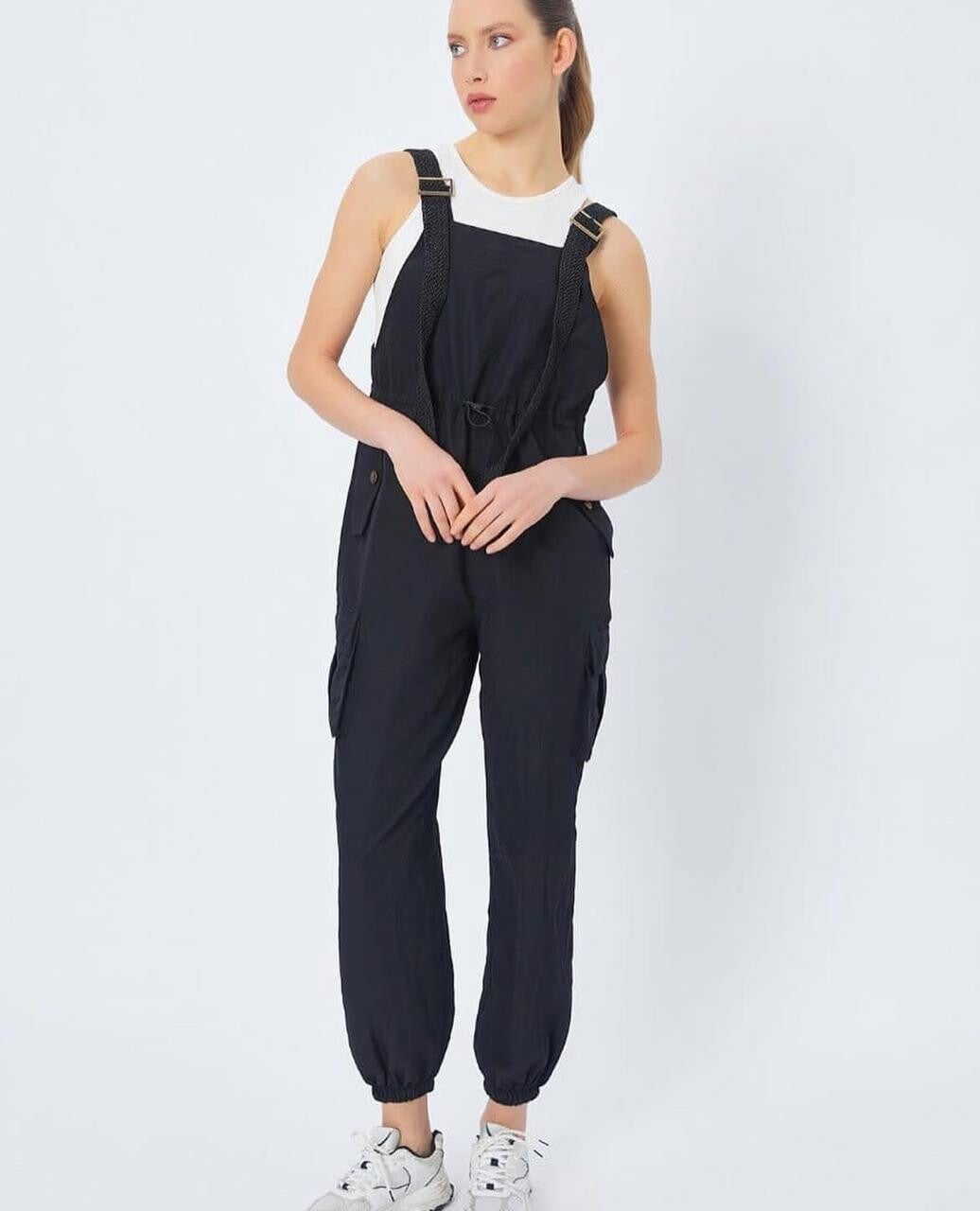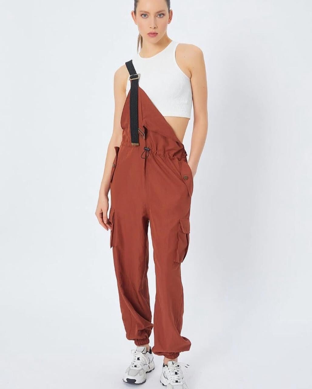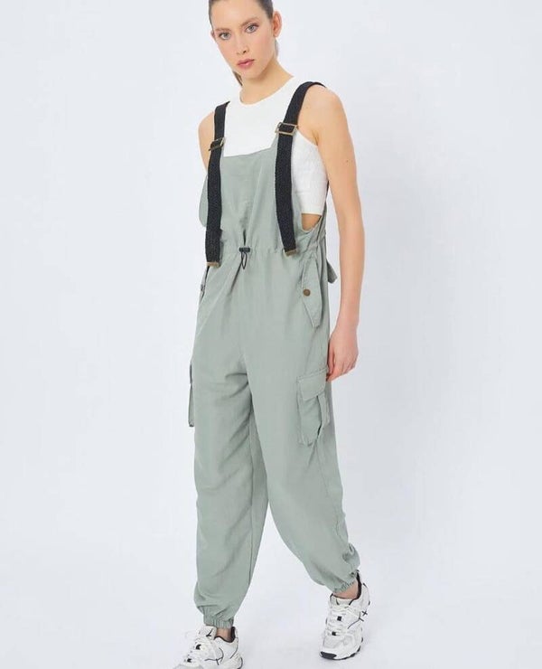 Overoll casual me stil modern dhe dizajn funksional, i përsosur për një pamje të lirshme dhe në trend gjatë gjithë ditës. Ky model kombinon rehatinë me estetikën urbane, duke e bërë një zgjedhje të shkëlqyer për aktivitete të përditshme, udhëtime apo dalje me miqtë.Dizajni i tij përfshin rripa të rregullueshëm me kapëse metalike që lejojnë përshtatje perfekte sipas gjatësisë dhe komoditetit tuaj. Pjesa e belit ka një lidhëse të fshehur për të theksuar siluetën dhe për t’i dhënë formë trupit, ndërkohë që fundet me mbledhje në kyçin e këmbës ofrojnë një stil sportiv dhe praktik.Overolli është pajisur me xhepa anësorë dhe xhepa cargo, të cilët jo vetëm shtojnë një prekje moderne, por ofrojnë edhe hapësirë shtesë për gjërat e vogla që doni të mbani me vete. Pëlhura e lehtë dhe e frymëmarrjes siguron lëvizje të lirshme dhe rehati maksimale, duke e bërë ideal për sezonet e ngrohta dhe për një ditë aktive.
