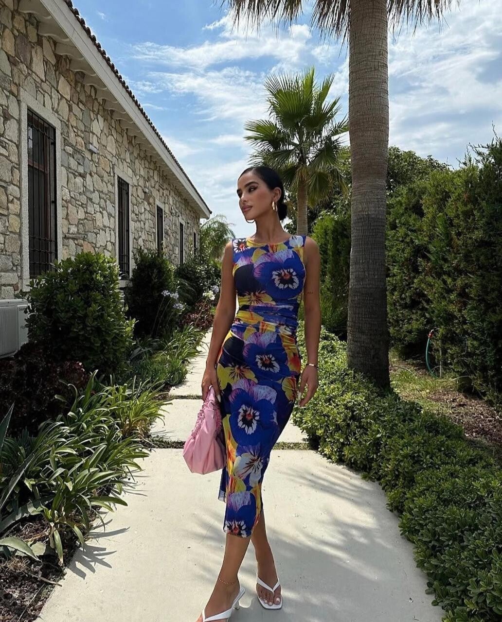 Ky fustan është një deklaratë e vërtetë stili dhe feminiteti, perfekt për ditët me diell, mbrëmjet verore apo eventet elegante në natyrë. Me një dizajn unik që kombinon ngjyra të gjalla si blu, e verdhë dhe rozë, ky fustan sjell një atmosferë tropikale dhe një energji pozitive që bie menjëherë në sy.Pjesa e sipërme me prerje elegante dhe detaje anësore të hapura i jep një prekje sensuale, duke nxjerrë në pah linjat natyrale të trupit. Përshtatet bukur me siluetën, duke krijuar një pamje të hijshme dhe të sofistikuar. Materiali i lehtë dhe i ajrosshëm siguron rehati gjatë gjithë ditës, ndërsa gjatësia midi ofron balancën perfekte mes finesës dhe prakticitetit.Ky fustan është ideal për pushime bregdetare, kokteje, darka romantike apo festa verore ku dëshironi të ndiheni unike dhe tërheqëse. Kombinohet lehtësisht me sandale elegante, taka të larta apo aksesorë minimalistë për të krijuar një pamje të kompletuar dhe moderne.