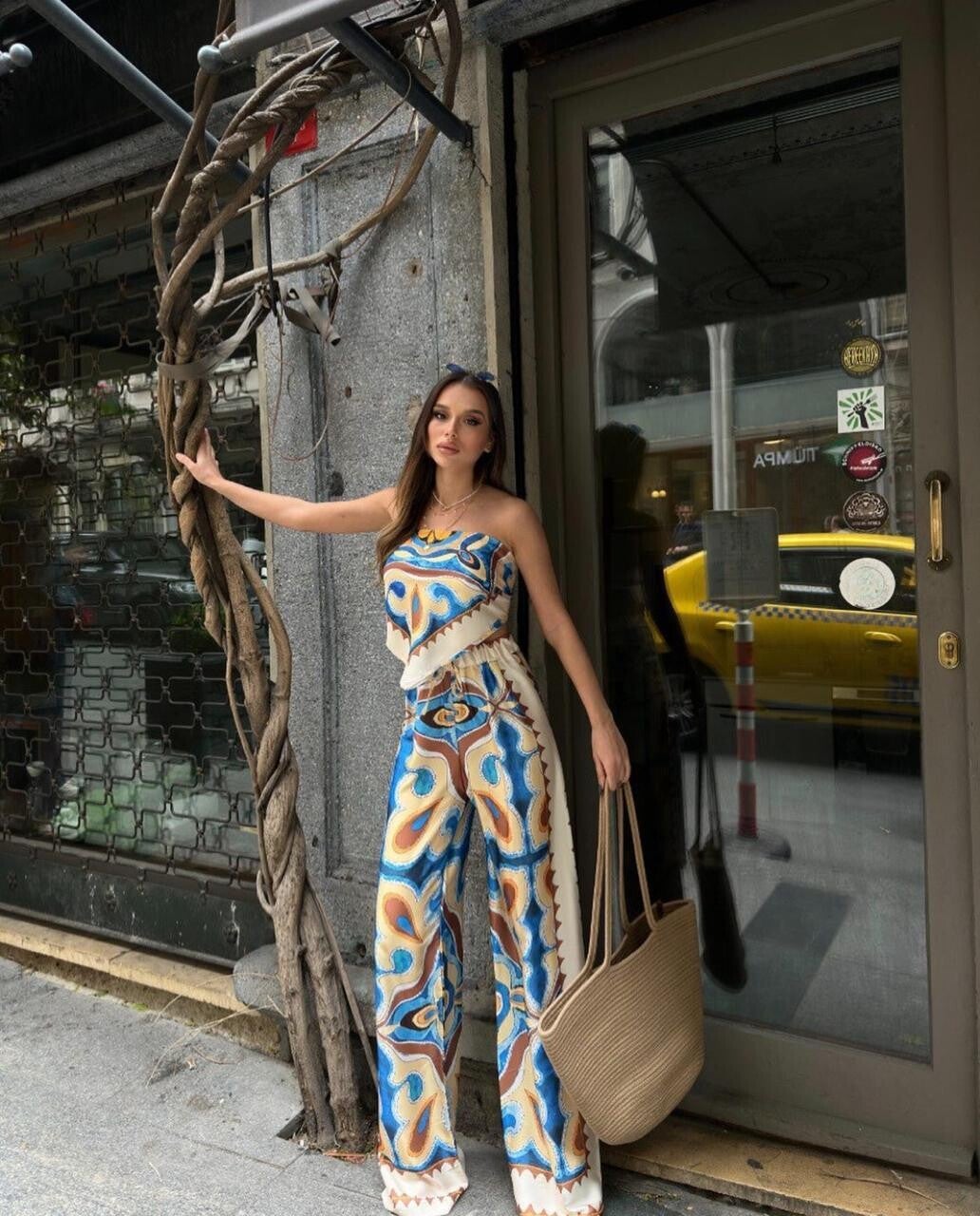 Pjesa e poshtme përbëhet nga pantallona të gjera me bel të lartë që ofrojnë rehati maksimale dhe liri lëvizjeje, ndërkohë që gjatësia e tyre e plotë zgjat vizualisht këmbët dhe krijon një pamje të rafinuar.Printi bohem me ngjyra të pasura si bluja, kafeja, e bardha dhe nuanca të arta sjellin një atmosferë verore, dinamike dhe artistike. Ky dizajn është perfekt për femrat që duan të duken të veçanta dhe tërheqëse në çdo dalje.