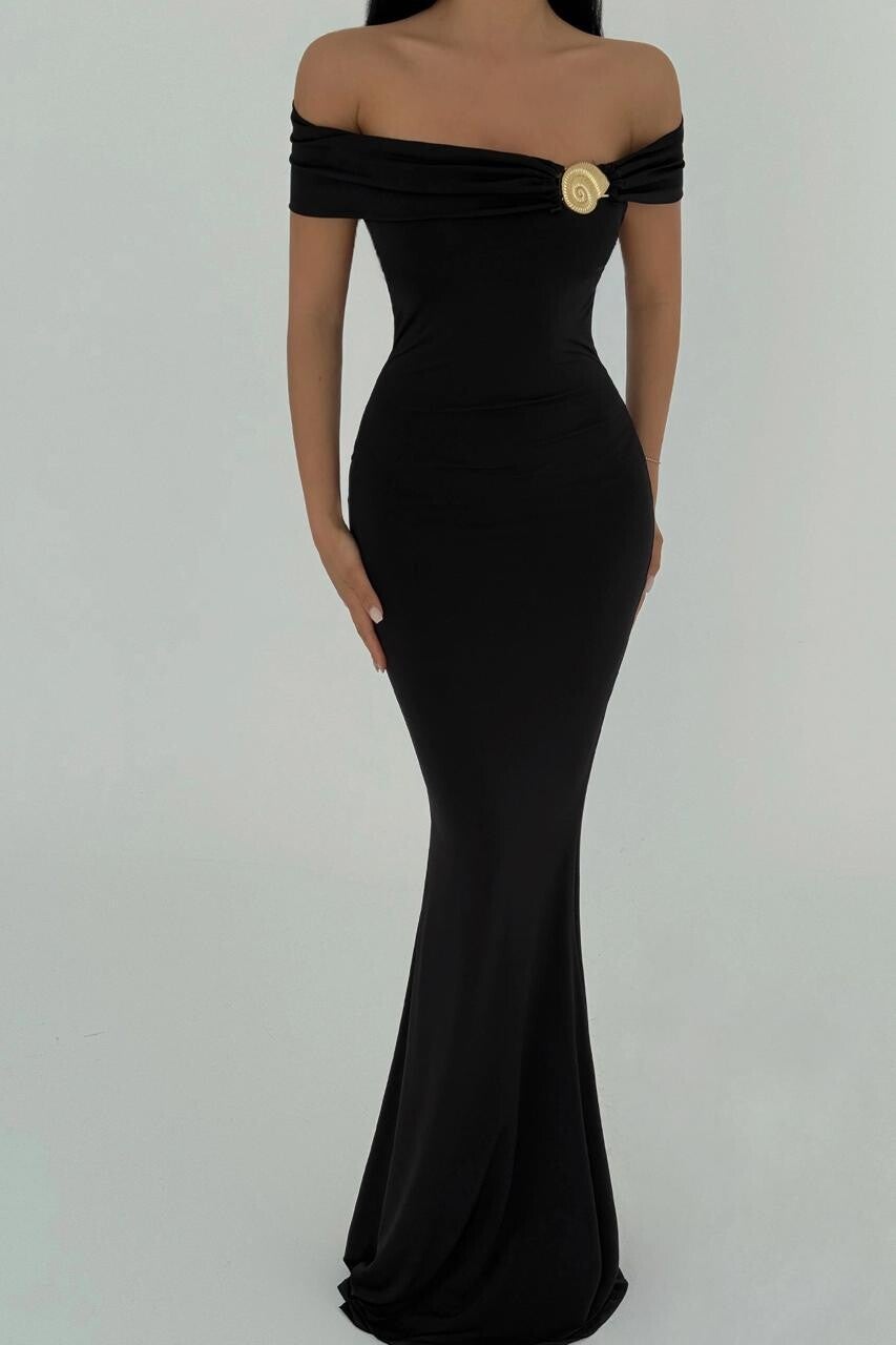 Ky fustan i gjatë në ngjyrë të zezë klasike është epitomi i elegancës dhe sofistikimit. Me dizajnin e tij mahnitës që nxjerr në pah linjat e trupit dhe detajin glamuroz në pjesën e bustit, ky fustan është zgjedhja perfekte për çdo event të veçantë ku dëshironi të shkëlqeni.Prerja me shpatulla jashtë dhe zbukurimi i artë në qendër shtojnë një prekje luksi dhe romantizmi, duke krijuar një pamje që tërheq vëmendje në çdo hap. Materiali elastik dhe me shkëlqim të lehtë përqafon siluetën duke ofruar rehati dhe përshtatje perfekte.