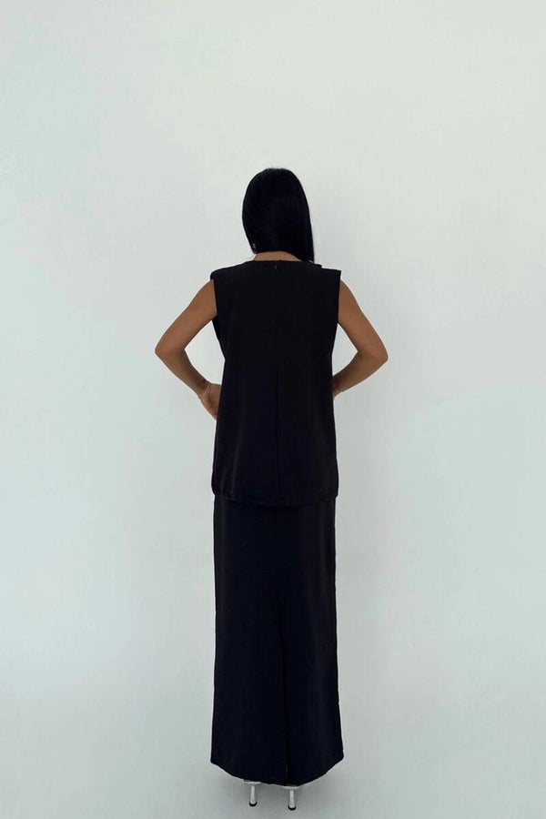 Ky set modern dhe ultra elegant në ngjyrë të zezë klasike është zgjedhja ideale për një pamje të sofistikuar dhe urbane. Përbëhet nga një jelek me prerje asimetrike dhe një fund i gjatë deri në fund të këmbëve, duke krijuar një kombinim minimalist, por tepër tërheqës. Detaji i hapjes së lehtë në bel shton një nuancë joshjeje të rafinuar, duke e bërë veshjen perfekte për mbrëmje elegante ose evente të veçanta.Materiali me cilësi të lartë siguron një rënie të butë dhe formë që përqafon trupin me elegancë. Ngjyra e zezë, gjithmonë në modë, ofron fleksibilitet të pafund për t’u kombinuar me aksesorë të ndryshëm, ndërsa dizajni minimalist sjell një estetikë moderne dhe të përjetshme.