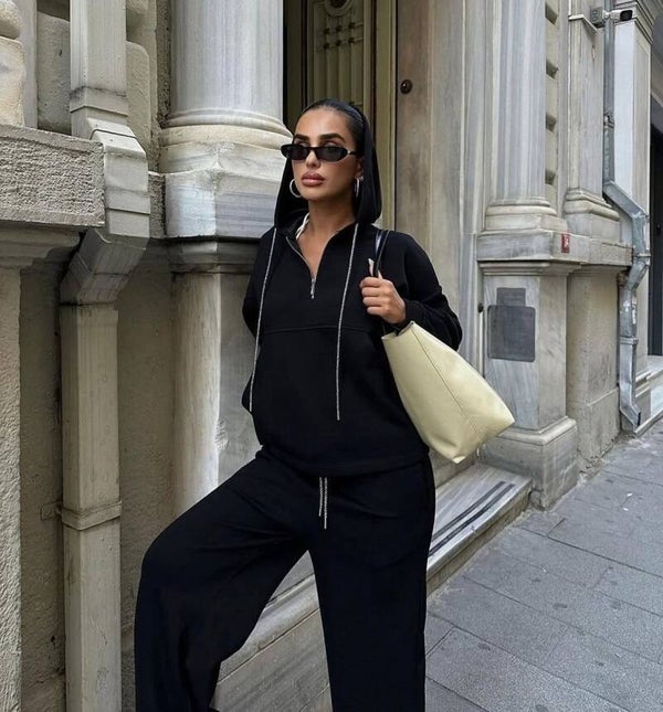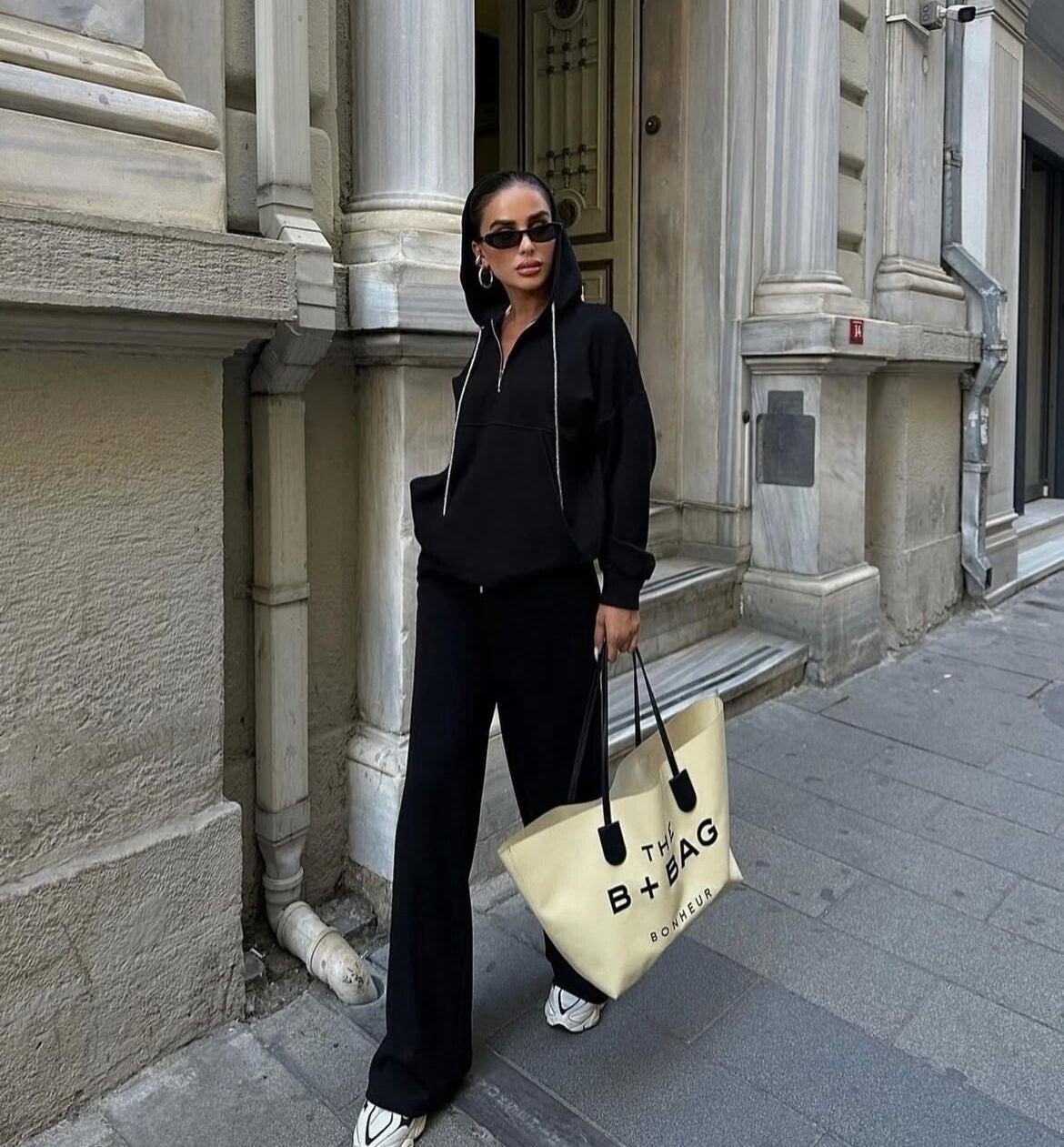 Për një pamje moderne, të pastër dhe gjithmonë në trend, ky set trening në ngjyrë të zezë është zgjedhja perfekte për çdo sezon. Dizajnuar për rehati maksimale dhe stil minimalist, ky set përbëhet nga një bluzë me kapuç dhe zinxhir gjysmë-zip, si dhe pantallona të gjera që ofrojnë liri totale lëvizjeje dhe një pamje urbane të sofistikuar.Bluzja me kapuç vjen me një dizajn praktik, xhepa të mëdhenj dhe lidhëse elegante, duke e bërë ideale për ditët kur dëshironi të ndiheni komode, por pa lënë mënjanë stilin. Pantallonat e gjera ofrojnë një qëndrim “relaxed fit” duke e bërë këtë set perfekt si për dalje të përditshme, ashtu edhe për udhëtime apo momente pushimi.Materiali i butë dhe cilësor siguron ngrohtësi dhe rehati, ndërsa ngjyra klasike e zezë e bën shumë të lehtë kombinimin me atlete, çanta statement apo aksesorë minimalistë. Ky set është ideal për të krijuar një pamje sportive-chic që përshtatet në çdo rast – nga shëtitjet në qytet, udhëtimet e shkurtra, deri te kafenetë me miqtë.