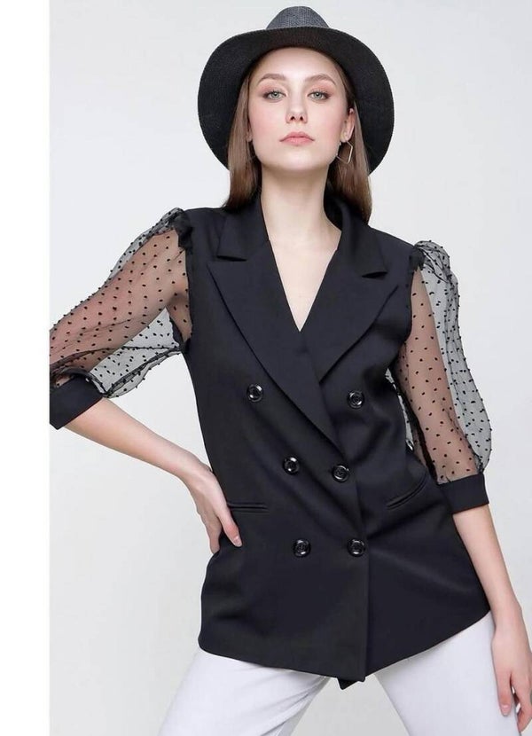 Kjo xhaketë unike në ngjyrë të zezë është zgjedhja perfekte për të shtuar një prekje luksoze dhe moderne në çdo kombinim. Dizajni i saj i veçantë me manga tulle të tejdukshme me pika delikate sjell një pamje femërore dhe shumë elegante, ndërsa silueta klasike me dy rreshta kopsa ofron një stil që qëndron mbi trendet.Materiali i cilësisë së lartë siguron formë të qëndrueshme dhe rehati gjatë gjithë ditës, ndërsa mëngët e lehta me tullë krijojnë një kontrast të bukur midis strukturës së xhaketës dhe delikatesës së detajeve. Kjo xhaketë është ideale për kombinime nga më të ndryshmet, qoftë për evente formale, darka elegante apo dalje të veçanta në mbrëmje.