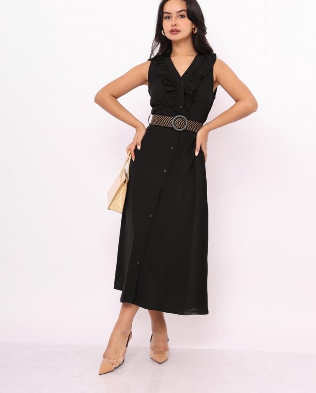 Ky fustan elegant në ngjyrë të zezë është zgjedhja ideale për çdo rast, duke kombinuar finesën klasike me detaje moderne që tërheqin vëmendjen. Me gjatësi midi dhe prerje të lehtë, ai ofron një siluetë që thekson elegancën natyrale të trupit, duke u përshtatur për evente formale, darka romantike apo dalje urbane.Modeli vjen me jakë V dhe detaje ruffles në pjesën e përparme, të cilat i japin një prekje femërore dhe romantike. Pjesa e përparme është e zbukuruar me rresht kopësash që shtojnë një element praktik dhe dekorativ njëkohësisht. Fustani kompletohet me një rrip të gjerë me dizajn gjeometrik, i cili thekson belin dhe krijon një pamje harmonike e të balancuar.