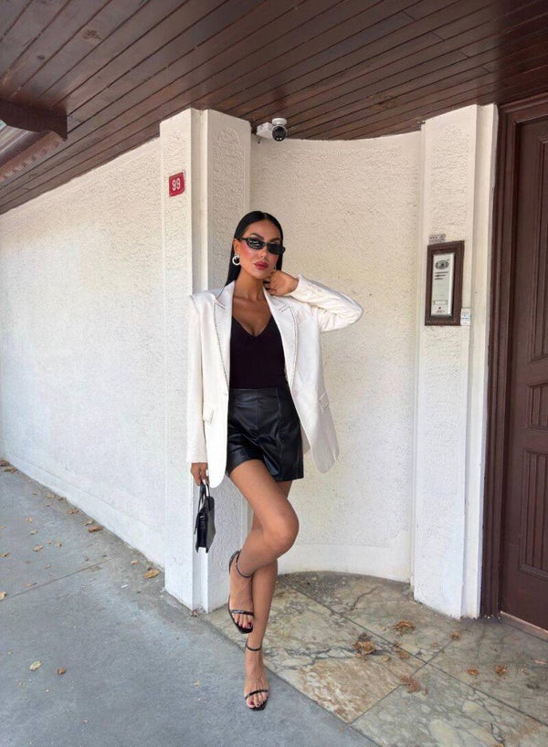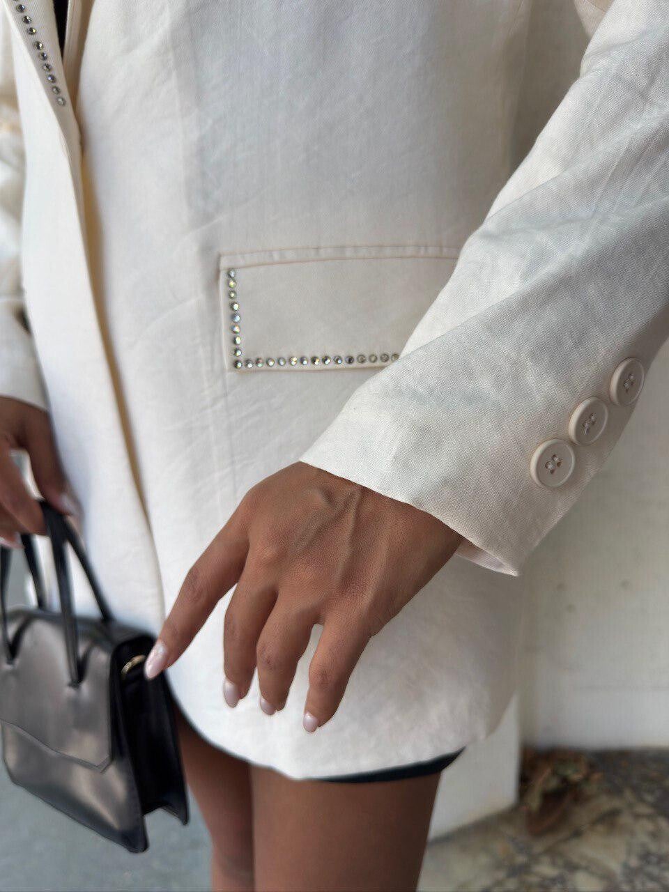 Shtoni një prekje sofistikimi dhe finesë në çdo paraqitje me këtë blazer luksoz në ngjyrë krem, i punuar me kujdes për të ofruar një pamje moderne dhe të rafinuar. Dizajni i tij klasik me jakë rever dhe prerje të drejtë kombinohet në mënyrë perfekte me detajet elegante të kristaleve, të cilat ndjekin vijën e jakës dhe xhepave, duke krijuar një shkëlqim të lehtë që e bën këtë veshje të veçantë.Materiali cilësor siguron rehati dhe qëndrueshmëri, ndërsa ngjyra neutrale krem është ideale për t’u kombinuar me çdo paletë ngjyrash, duke e bërë këtë blazer një pjesë bazë për çdo stinë dhe rast. Mbyllja me një buton në mes thekson belin lehtësisht dhe e bën praktike për t’u veshur si në evente formale ashtu edhe në dalje më casual.