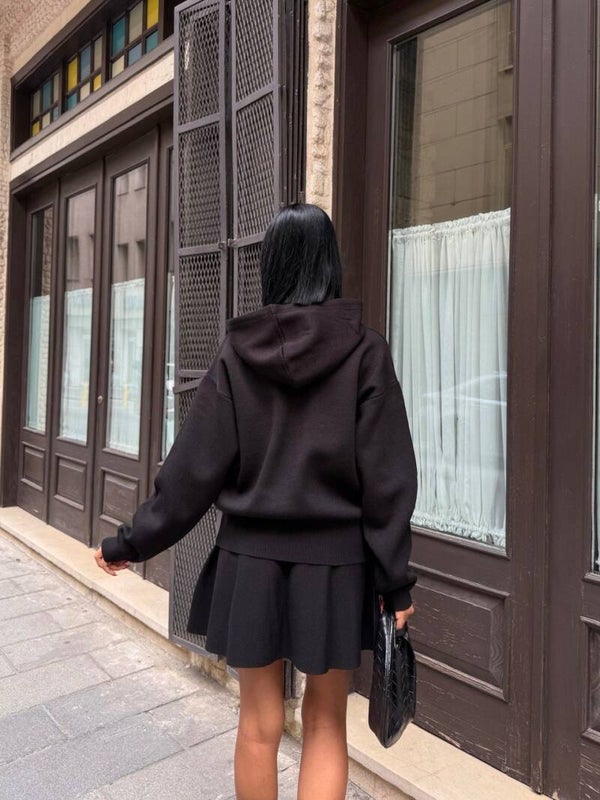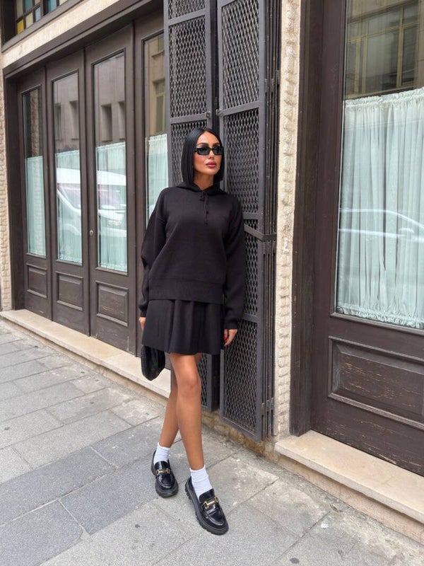 Për një stil që kombinon rehatinë sportive me elegancën urbane, ky set dy-pjesësh në ngjyrë të zezë është zgjedhja perfekte për çdo ditë. Përbëhet nga një bluzë me kapuç (hoodie) me prerje të lirshme dhe një fund i shkurtër me bel elastik, duke krijuar një outfit të balancuar mes look-ut casual dhe një ndjenje moderne të sofistikuar.Bluza është realizuar me material të butë, që siguron ngrohtësi dhe komoditet, ndërsa dizajni minimalist në ngjyrë të zezë e bën të lehtë për t’u kombinuar me këpucë sportive, loafers apo çizme. Fundi me gjatësi mbi gju shton një prekje femërore dhe tërheqëse, duke krijuar kontrast të bukur me stilin sportiv të pjesës së sipërme.