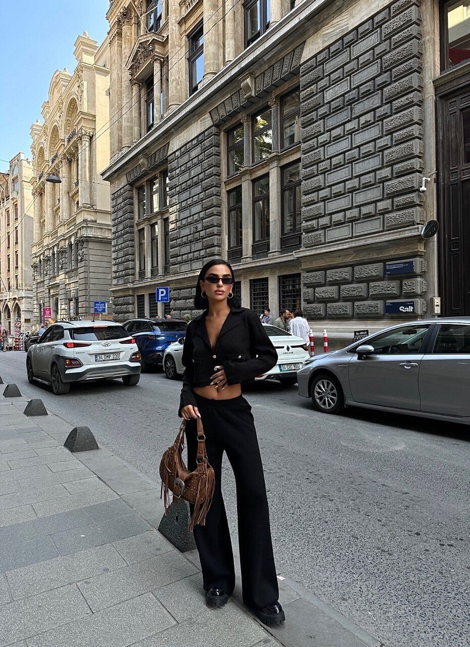 Ky kostum elegant dhe modern në ngjyrë të zezë është një zgjedhje perfekte për femrat që kërkojnë një pamje sofistikuar, urbane dhe me stil minimalist. Seti përbëhet nga një xhaketë crop me dizajn të strukturuar dhe pantallona me prerje të lirshme, duke krijuar një kombinim që thekson linjat e trupit dhe ofron një siluetë elegante e të zgjatur.Xhaketa crop ka një dizajn unik me jakë klasike, kopsa dekorative dhe xhepa të vegjël që shtojnë detaje moderne. Prerja e shkurtuar lejon krijimin e një pamjeje të guximshme dhe të sofistikuar njëkohësisht, duke e bërë të lehtë për ta kombinuar si për evente formale ashtu edhe për dalje të përditshme. Pantallonat me bel të lartë janë të dizajnuara me prerje të drejtë dhe gjatësi të gjatë për një efekt optik që zgjat këmbët, duke ofruar rehati dhe lëvizshmëri maksimale.