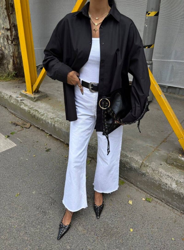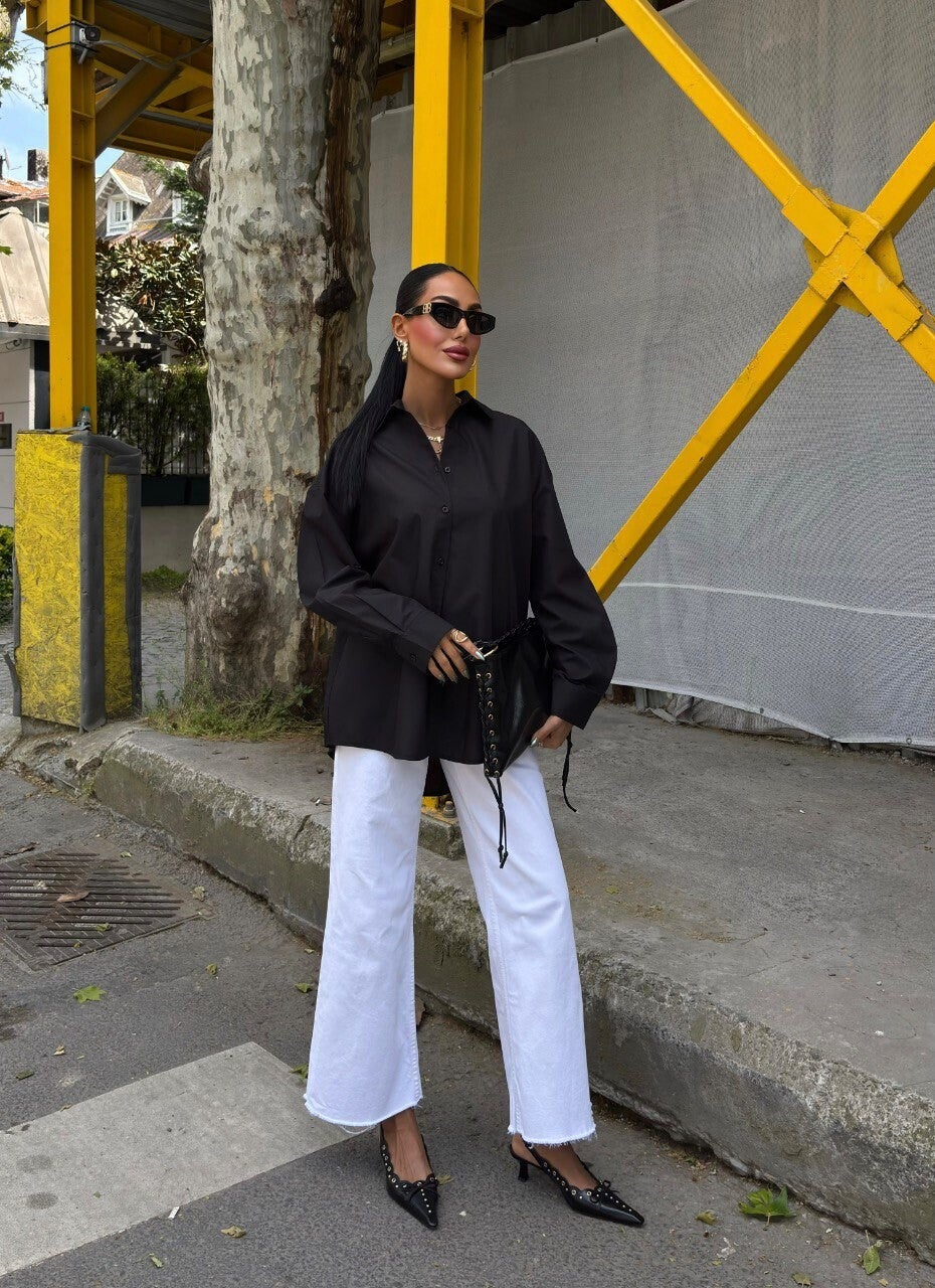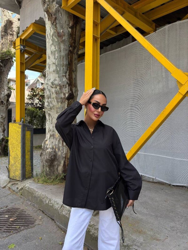Kjo këmishë elegante oversize në ngjyrë të zezë klasike është pjesa ideale për të krijuar një look modern, minimalist dhe plot stil. E punuar nga material cilësor me strukturë të butë dhe të lehtë, kjo këmishë siguron rehati maksimale dhe një rënie perfekte mbi trup, duke e bërë të përshtatshme për çdo stinë dhe çdo rast.Dizajni oversize ofron një siluetë të lirshme dhe komode, duke e bërë lehtësisht të kombinueshme me xhinse, pantallona elegante apo edhe funde për një pamje më femërore. Ka një jakë klasike që i jep finesë, mbyllje me kopsa të fshehura për një përfundim të pastër dhe mëngë të gjata me mansheta të rregullueshme që mund të mbështillen për një stil më casual. Ngjyra e zezë universale sjell elegancë dhe mund të kombinohet me pothuajse çdo ngjyrë apo aksesor.