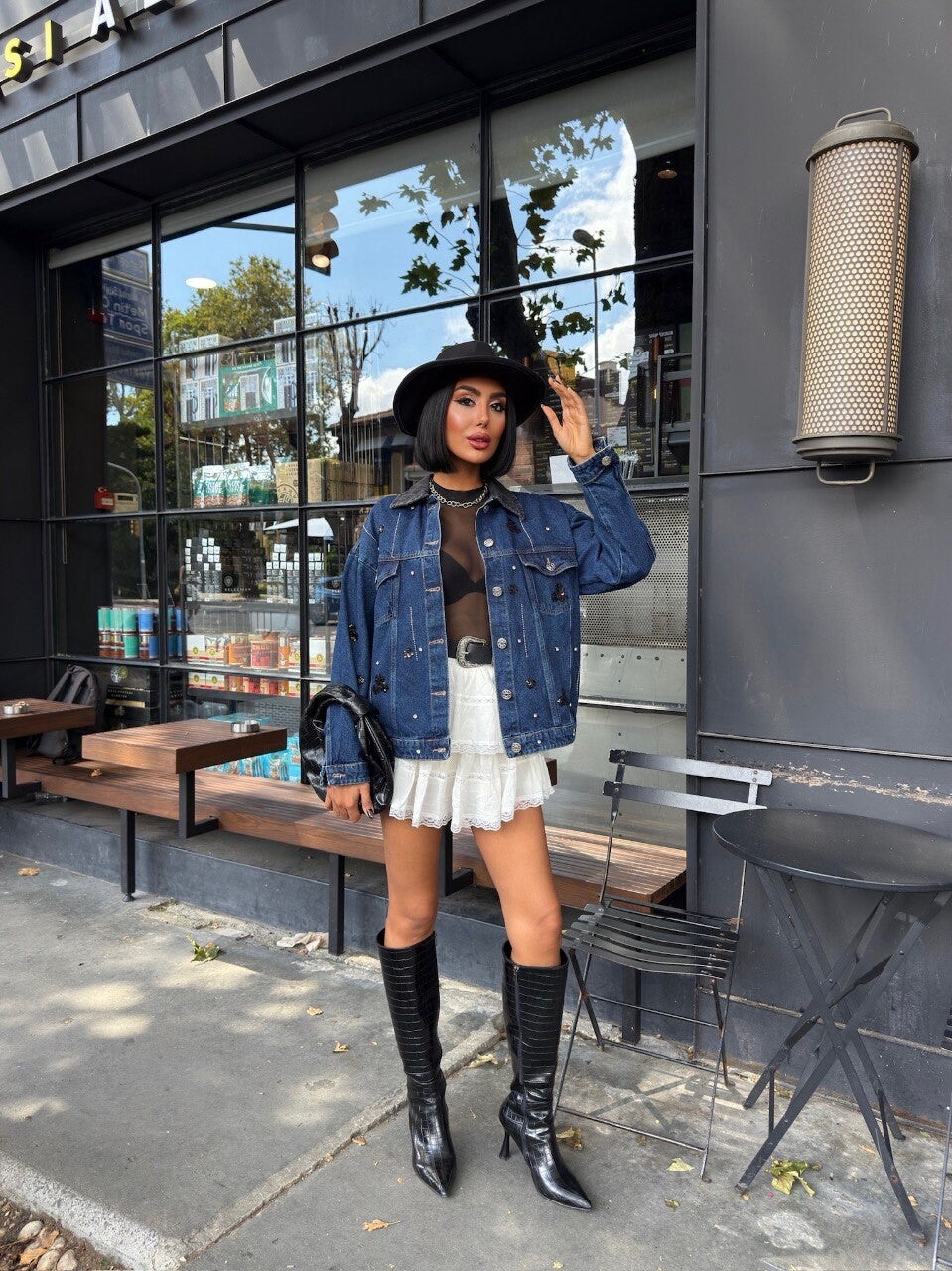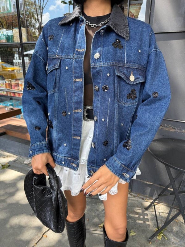 Kjo xhaketë xhins unike është një pjesë kryesore në gardërobën e çdo fashioniste që do të kombinojë stilin casual me një prekje glamour. E punuar nga denim cilësor në ngjyrë blue klasik, xhaketa dallohet për detajet dekorative me rruaza dhe aplikacione me shkëlqim, të shpërndara me kujdes në të gjithë sipërfaqen.Modeli i saj ka një prerje oversize që ofron rehati maksimale dhe një look modern, ndërsa jakë klasike dhe mbyllja me kopsa metalike i japin pamje autentike xhinsi. Xhepat e përparëm jo vetëm që shtojnë funksionalitet, por edhe theksojnë stilin urban të kësaj pjese.Kjo xhaketë është perfekte për t’u veshur mbi fustane romantike, funde me dantellë, apo kombinime me pantallona të ngushta për një kontrast interesant mes elegancës dhe casual chic. Mund të përdoret si pjesë e përditshme gjatë ditëve të freskëta, ose si aksesor i veçantë në daljet e mbrëmjes.