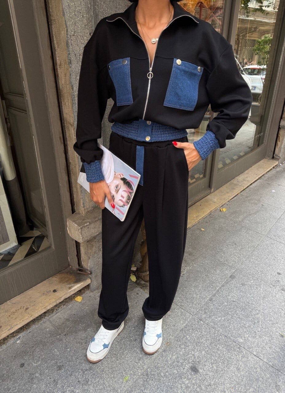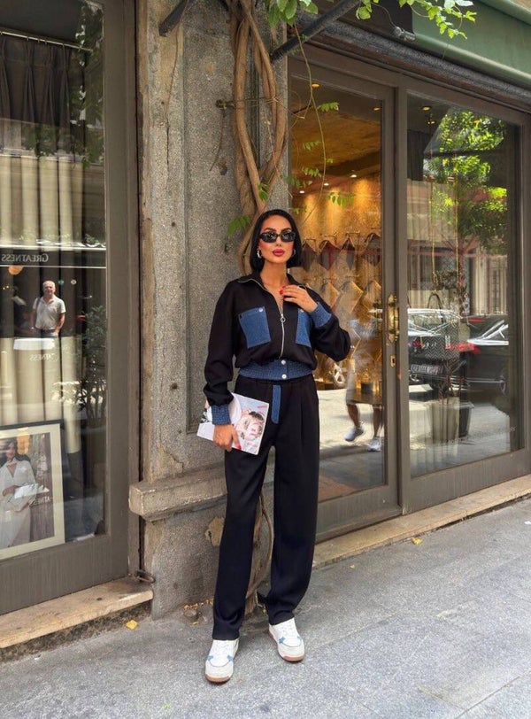 Ky kostum dy-pjesësh urban është kombinimi perfekt i stilit sportiv dhe elegancës casual, i menduar për femrat që kërkojnë rehati pa hequr dorë nga moda. Me një dizajn dinamik dhe elemente kontrasti, ai sjell një pamje të freskët dhe bashkëkohore që bie në sy në çdo dalje.Xhaketa me prerje të lirshme përmban xhepa të mëdhenj në ngjyrë denim blu, të theksuar me kapëse metalike dhe zinxhir dekorativ në pjesën e përparme, duke krijuar një efekt modern dhe të pazakontë. Detajet në jakë dhe në mansheta, në të njëjtën ngjyrë denim, i japin një dimension trendy dhe të rafinuar këtij dizajni unik.Pantallonat kanë një prerje të drejtë e të rehatshme, me bel elastik që përshtatet në mënyrë perfekte duke siguruar liri lëvizjeje gjatë gjithë ditës. Kombinimi i materialit të butë e cilësor me detajet denim sjell një përzierje harmonike mes look-ut sportiv dhe stilit urban chic.