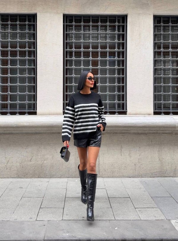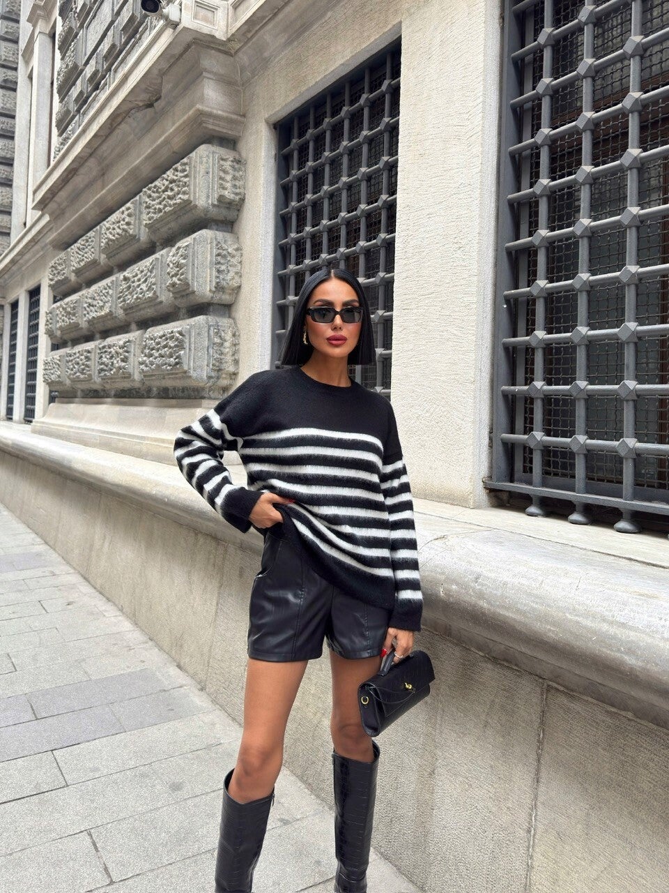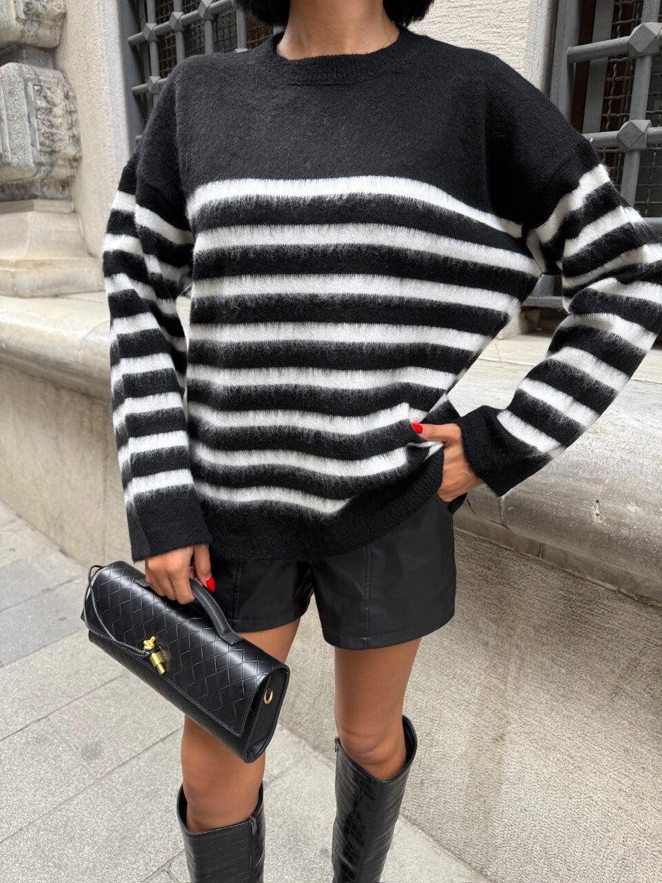 Kjo bluzë me dizajn modern me vija bardh e zi është një kombinim perfekt i rehatisë dhe stilit urban, duke e bërë një zgjedhje të shkëlqyer për veshje të përditshme apo për pamje casual-chic. Me një siluetë të lirshme dhe material të butë, bluza siguron një ndjesi të këndshme në trup ndërsa ofron liri lëvizjeje gjatë gjithë ditës.Dizajni me vija horizontale bardh e zi i jep një pamje klasike, gjithmonë në modë, ndërkohë që kontrasti elegant mes ngjyrave krijon një efekt vizual tërheqës. Pjesa e qafës ka një model klasik “crew neck”, i cili e bën të lehtë kombinimin me xhaketa, pallto apo aksesorë të ndryshëm.Materiali është i butë dhe i ngrohtë, perfekt për ditët e freskëta të vjeshtës dhe dimrit, duke siguruar komfort dhe stil në të njëjtën kohë. Bluza mund të kombinohet në mënyrë perfekte me pantallona të ngushta, xhinse, funde apo edhe pantallona lëkure, duke krijuar pamje nga më të ndryshmet – nga casual streetwear deri te outfit-e më elegante.