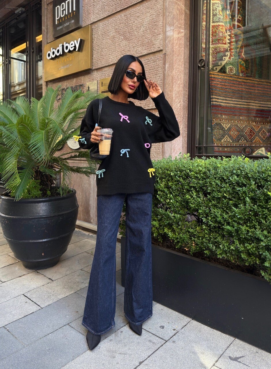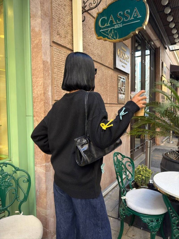 Sillni në garderobën tuaj një prekje argëtuese dhe plot jetë me këtë bluzë unike me fjongo shumëngjyrëshe. E punuar në një bazë të zezë elegante, kjo bluzë shquhet për detajet e saj lozonjare – fjongo të vogla në ngjyra pastel si rozë, blu, verdhë dhe jeshile të lehtë, që i japin një energji pozitive dhe një pamje krejt të veçantë.Materiali i butë dhe i ngrohtë e bën këtë bluzë të përshtatshme për stinën e vjeshtës dhe dimrit, duke ofruar rehatinë e duhur për t’u veshur gjatë gjithë ditës. Përshtatet në mënyrë perfekte me xhinse, pantallona të gjera apo funde të ngushta, duke krijuar një outfit të lehtë dhe modern për çdo rast – nga një kafe me miqtë deri te një dalje e thjeshtë në qytet.