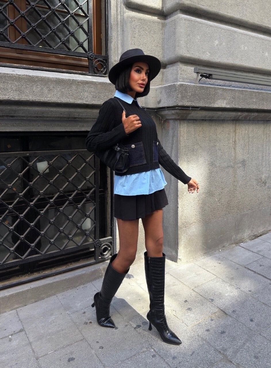 Kjo bluzë e zezë elegante me detaje denim është kombinimi perfekt mes stilit klasik dhe elementeve moderne. Me një dizajn të veçantë që përfshin xhepa përpara në ngjyrë denim me kopsa dekorative dhe një jakë këmishë në ngjyrë blu të hapur, kjo pjesë sjell një kontrast tërheqës që e bën çdo veshje unike dhe plot karakter.Materiali cilësor me teksturë të lehtë ofron rehati gjatë gjithë ditës, ndërsa prerja e saj me gjatësi ideale e bën të përshtatshme si për kombinime zyre, ashtu edhe për dalje të përditshme. Xhepat me detaje qepjeje në ngjyrë kafe shtojnë një aksent urban dhe trendy, duke e kthyer këtë bluzë në një statement piece që nuk kalon pa u vënë re.