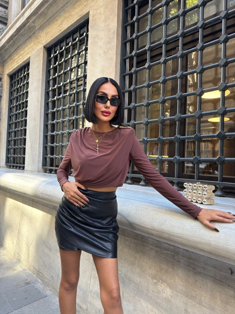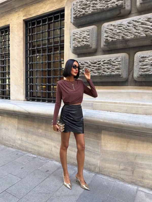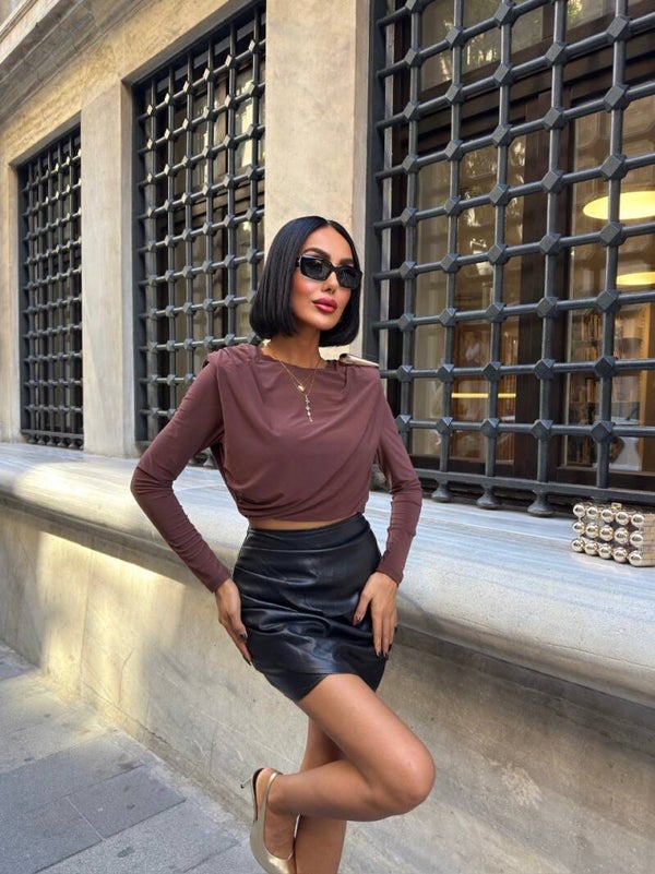 Kjo bluzë moderne me mëngë të gjata në ngjyrë kafe të butë është zgjedhja perfekte për një pamje që kombinon finesën dhe rehatinë. Me drapim elegant në pjesën e përparme, bluza krijon një efekt të valëzuar që i jep dimension dhe sofistikim çdo veshjeje.Materiali i lehtë dhe elastik përshtatet butësisht me trupin, duke ofruar komoditet gjatë gjithë ditës pa sakrifikuar stilin. Prerja e shkurtër (crop) i shton një prekje bashkëkohore, duke e bërë ideale për t’u kombinuar me funde apo pantallona me bel të lartë. Ngjyra e saj neutrale kafe është e lehtë për t’u kombinuar me ngjyra të ndryshme, duke e bërë një pjesë kyçe për garderobën tuaj.Detajet diskrete në supe dhe linjat e pastra e bëjnë këtë bluzë të përshtatshme si për dalje të përditshme, ashtu edhe për mbrëmje elegante. Mund ta vishni me një fund lëkure për një pamje më të guximshme ose me pantallona klasike për një stil më minimalist e chic.