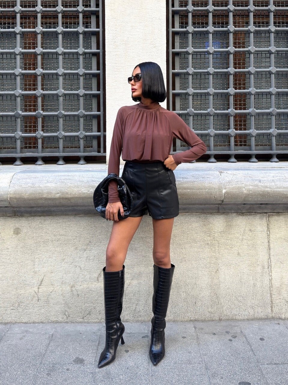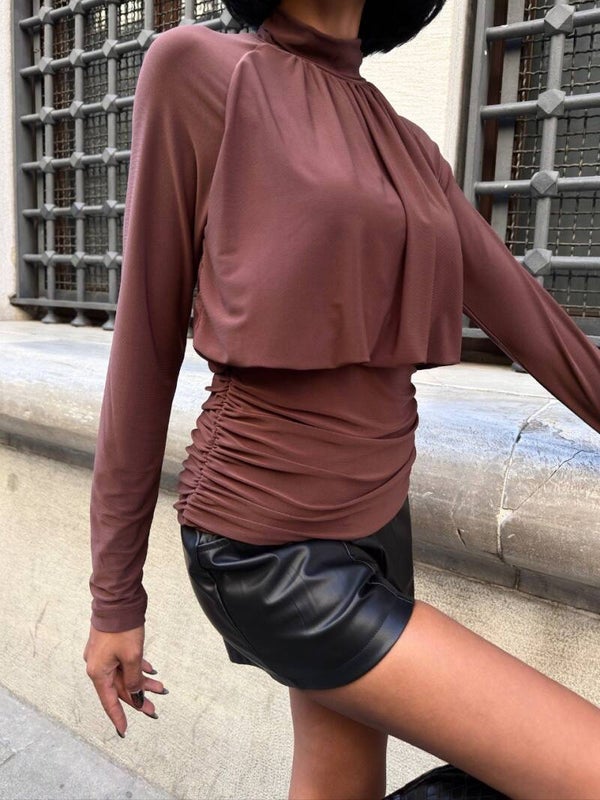 Kjo bluzë elegante me mëngë të gjata në ngjyrë kafe është një zgjedhje perfekte për femrat që kërkojnë një pamje moderne dhe të sofistikuar. Me qafë të lartë dhe pala dekorative në pjesën e përparme, kjo bluzë sjell një harmoni të bukur mes stilit klasik dhe detajeve bashkëkohore.Prerja e mbledhur anash në bel krijon një efekt që thekson linjat e trupit në mënyrë delikate, duke ofruar një siluetë harmonike dhe shumë femërore. Materiali i butë dhe elastik siguron rehati maksimale gjatë gjithë ditës, ndërsa ngjyra kafe i jep një ngrohtësi dhe finesë të veçantë çdo kombinimi.Kjo bluzë është ideale për t’u veshur si në ambiente zyrtare, ashtu edhe për evente apo dalje në mbrëmje. Kombinohet lehtësisht me pantallona elegante, funde me bel të lartë ose pantallona lëkure për një pamje më tërheqëse dhe urban-chic.