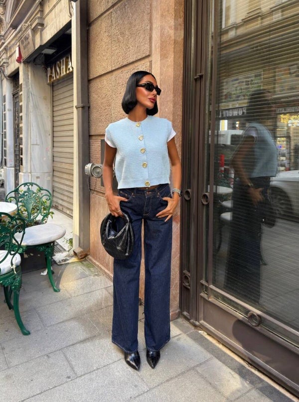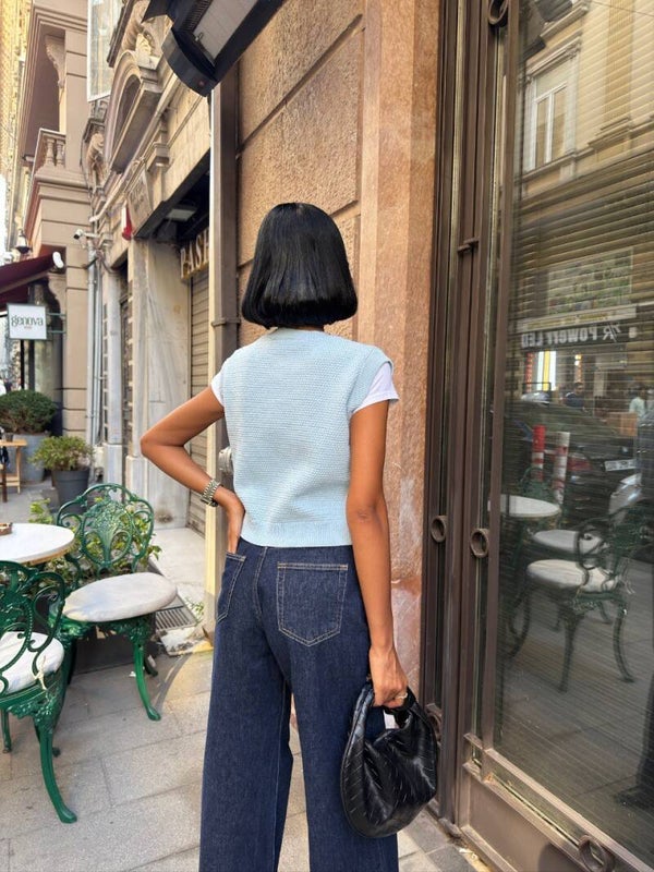 Ky jelek elegant në ngjyrë blu pastel sjell një frymë freskie dhe sofistikimi në gardërobën tuaj, duke e bërë të përshtatshëm për çdo sezon. I punuar me një material triko të lehtë me teksturë delikate, ky jelek kombinon komoditetin me një stil të rafinuar, perfekt si për veshje casual, ashtu edhe për kombinime më të kuruara.Dizajni me prerje të drejtë dhe gjatësi deri në bel krijon një siluetë të pastër dhe moderne, ndërsa kopsat dekorative në ngjyrë ari me detaje elegante i shtojnë një prekje luksoze dhe shik. Mund të vishet mbi një T-shirt të bardhë për një look urban dhe të relaksuar, ose mbi një këmishë për një stil më të rregullt dhe zyrtar.