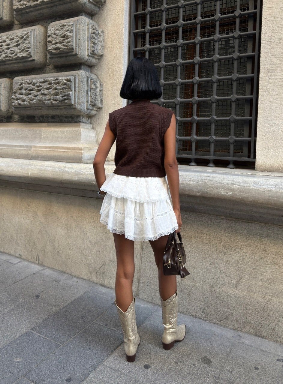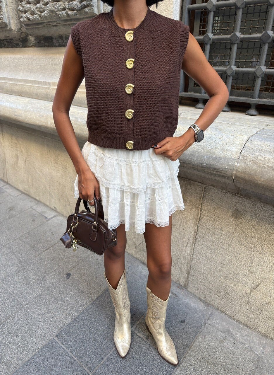 Ky jelek triko në ngjyrë kafe të thellë është një veshje perfekte për t’i dhënë stil dhe elegancë çdo kombinimi, duke u bërë një pjesë unike e garderobës suaj. I punuar me një material triko me teksturë të veçantë, ky jelek sjell komoditet dhe një pamje të sofistikuar që mund të vishet gjatë gjithë vitit.Dizajni me prerje të drejtë dhe pa mëngë e bën ideal për kombinime të ndryshme, ndërsa kopsat dekorative në ngjyrë ari me detaje elegante i japin një prekje luksoze dhe origjinale. Ky model mund të vishet mbi një këmishë ose bluzë për një pamje të kuruar, ose direkt mbi lëkurë për një look modern dhe të guximshëm.