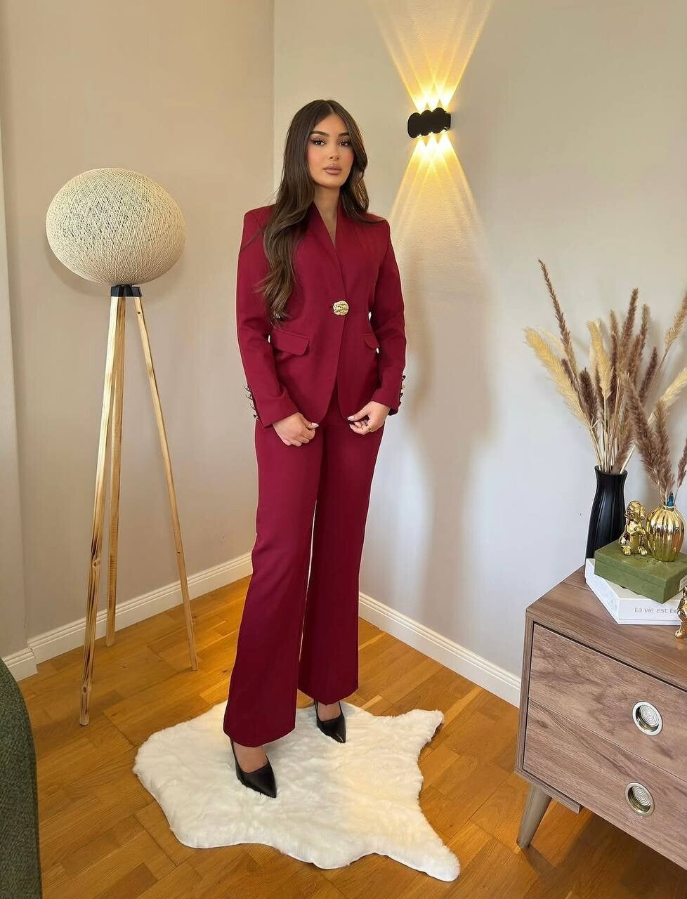 Ky kostum elegant në ngjyrë bordo është një zgjedhje perfekte për femrat që duan të reflektojnë klas, vetëbesim dhe sofistikim. Me një prerje moderne dhe të kuruar deri në detaj, ky set përbëhet nga xhaketa elegante dhe pantallonat e drejta, duke krijuar një siluetë të rregullt dhe plot hijeshi.Xhaketa vjen me një stil minimal dhe një kopëse dekorative në ngjyrë ari, e cila thekson belin dhe shton një prekje luksoze. Pjesa e pasme e mëngëve është e zbukuruar me detaje elegante me kopsa, duke i dhënë një pamje unike dhe femërore.