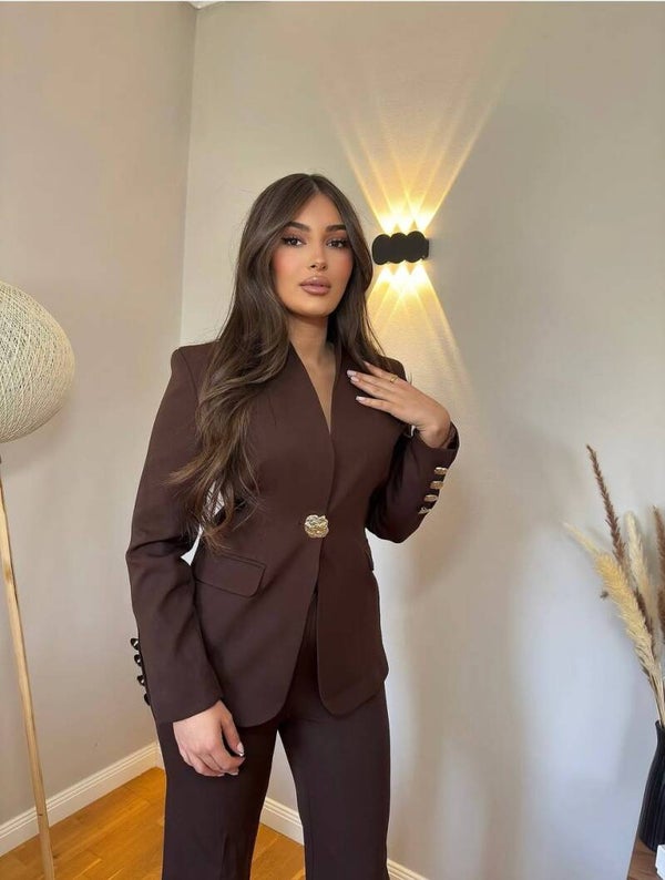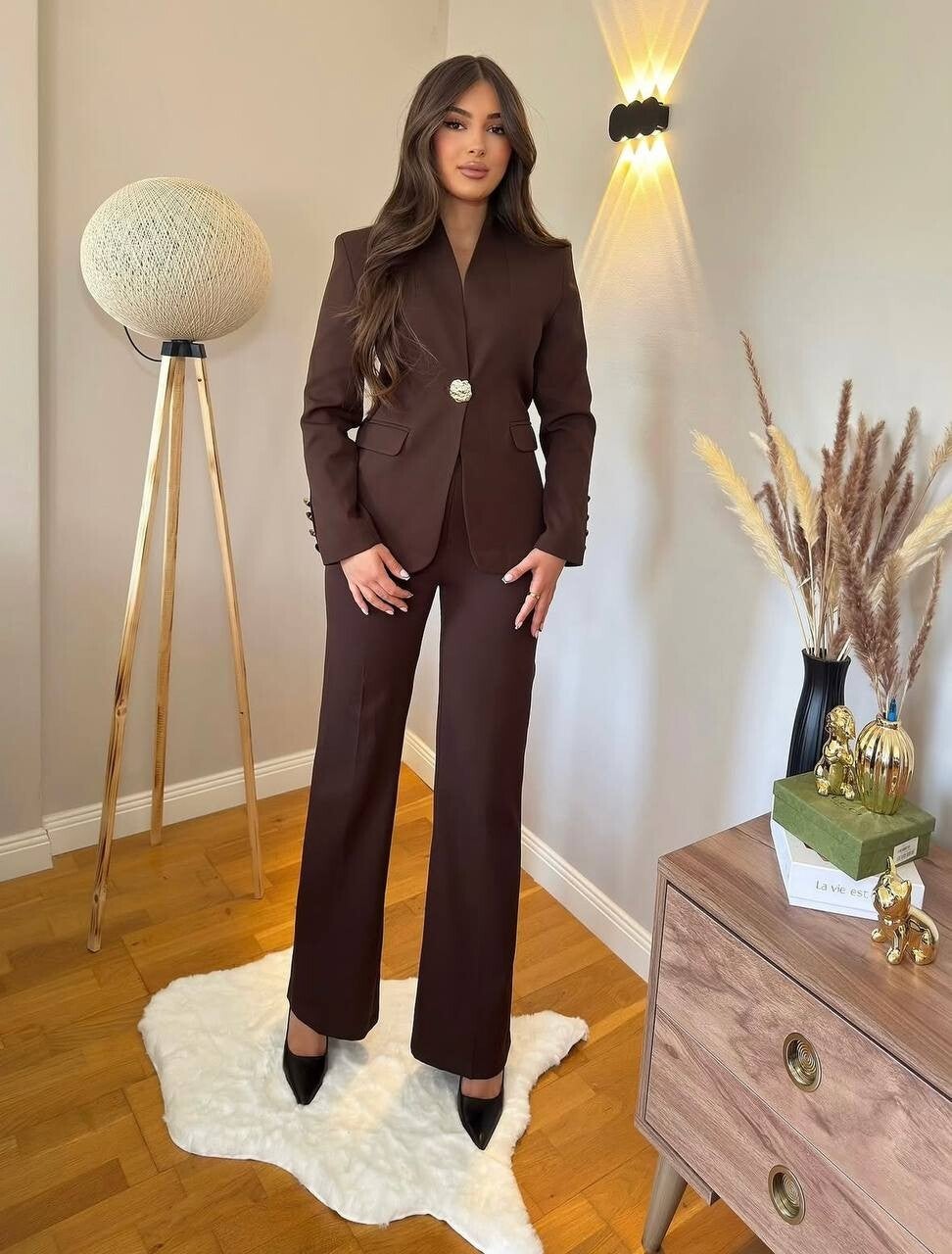 Sillni në garderobën tuaj një prekje elegance dhe profesionalizmi me këtë kostum modern dy copësh, perfekt për raste biznesi, evente formale apo edhe dalje të veçanta. Kostumi vjen në një ngjyrë kafe të errët klasike, e cila i shton rafinim çdo pamjeje, duke ju dhënë siguri dhe stil në çdo hap.