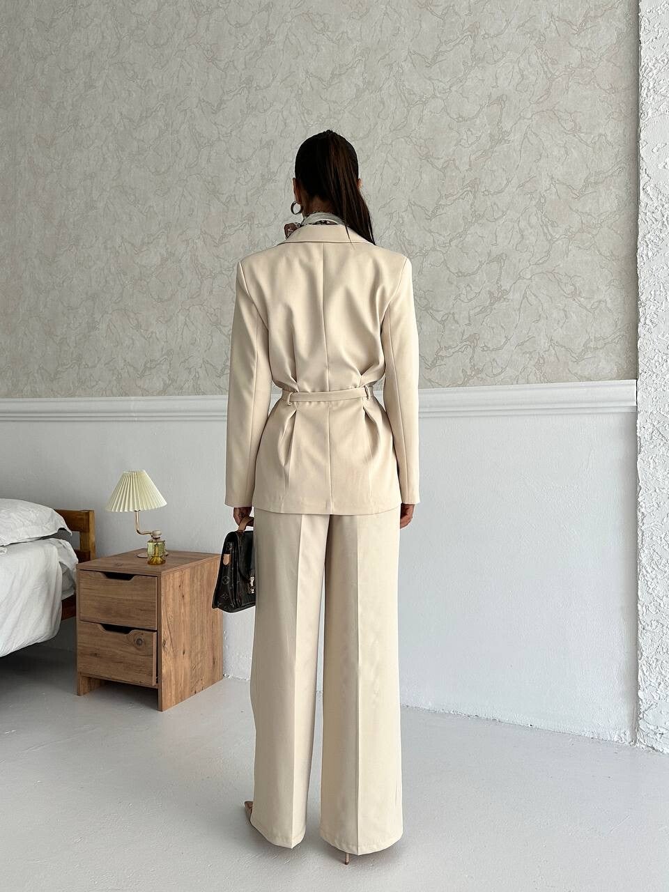 Reflektoni hijeshi dhe finesë me këtë kostum dy copësh në ngjyrë bezhë krem, një zgjedhje e sofistikuar për çdo rast. Me një dizajn modern dhe minimalist, ky set është ideal për ambiente profesionale, takime zyrtare, por gjithashtu edhe për evente elegante apo dalje të veçanta.