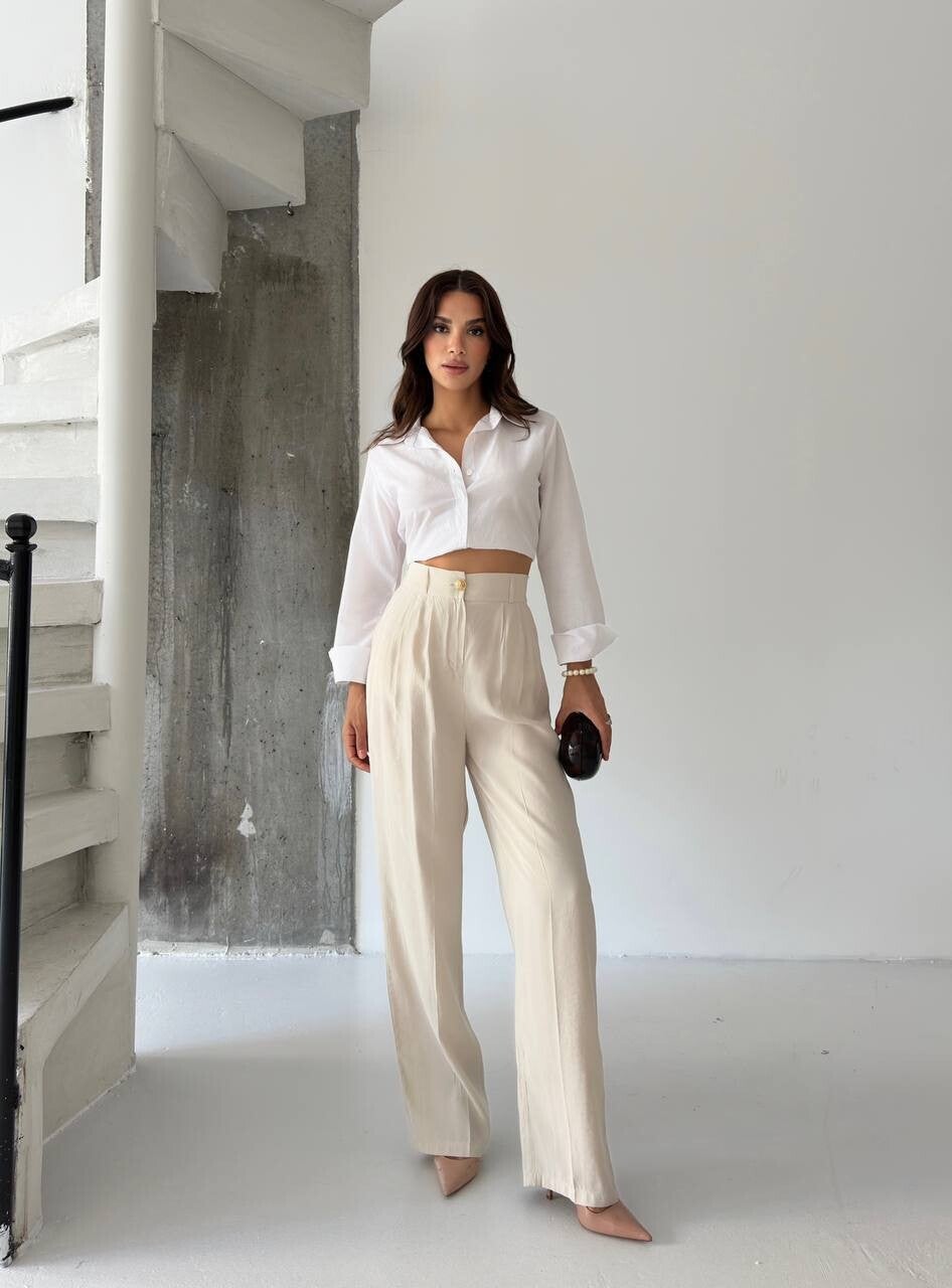 Dizajni i pantallonave theksohet nga beli i lartë i sheshtë, i kompletuar me një kopsë dekorative në ngjyrë ari, që i shton një detaj luksoz dhe delikat. Palosjet e lehta në pjesën e përparme krijojnë volum dhe e bëjnë siluetën më të rafinuar.
