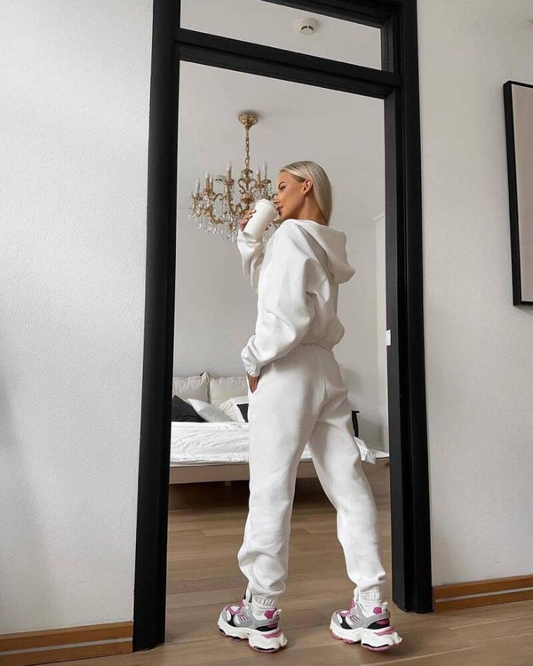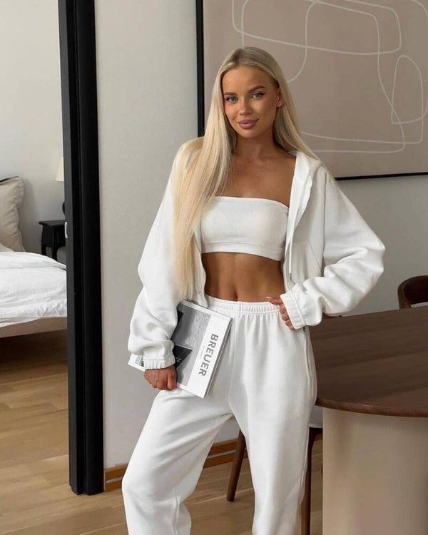 Ky kostum i bardhë për femra është mishërimi perfekt i finesës minimaliste dhe rehatisë urbane. I krijuar për vajzat që duan të ndihen komode por gjithmonë me stil, ky set përbëhet nga tre pjesë harmonike: crop top elegant, xhup me kapuç dhe pantallona të gjera me bel elastik.