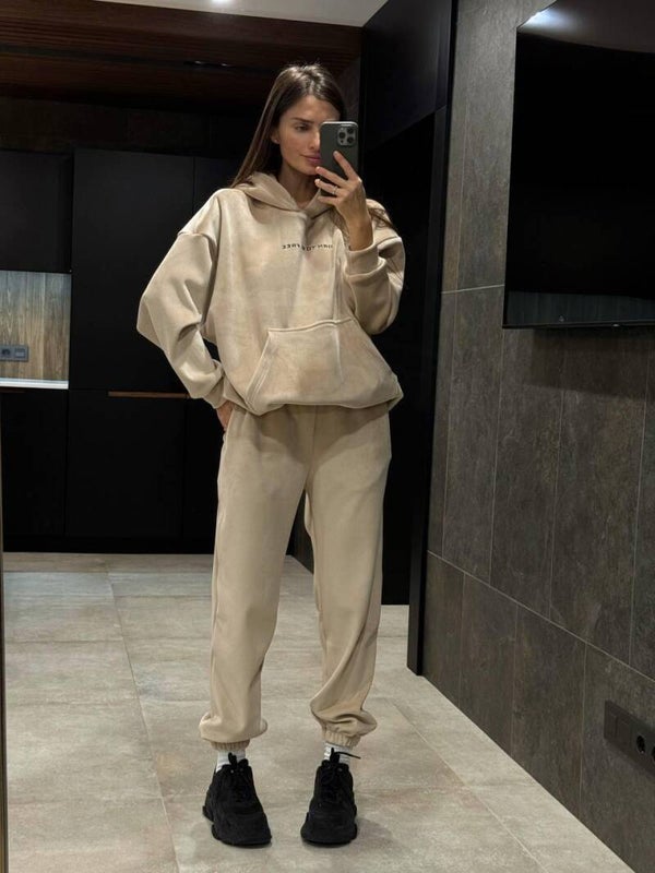 Xhupi me kapuç dhe mbishkrimin “Born To Be Free” përçon frymën e pavarësisë dhe vetëbesimit, ndërsa pantallonat me bel elastik përshtaten në mënyrë të përsosur me trupin, duke siguruar lëvizje të lirë dhe një pamje harmonike.