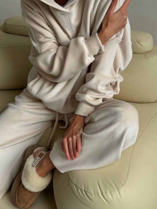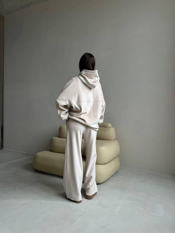 Xhupi “oversized” me kapuç shton një prekje sportive dhe komode, ndërsa pantallonat me prerje të gjerë dhe bel elastik i japin trupit një siluetë të rrjedhshme dhe elegante.